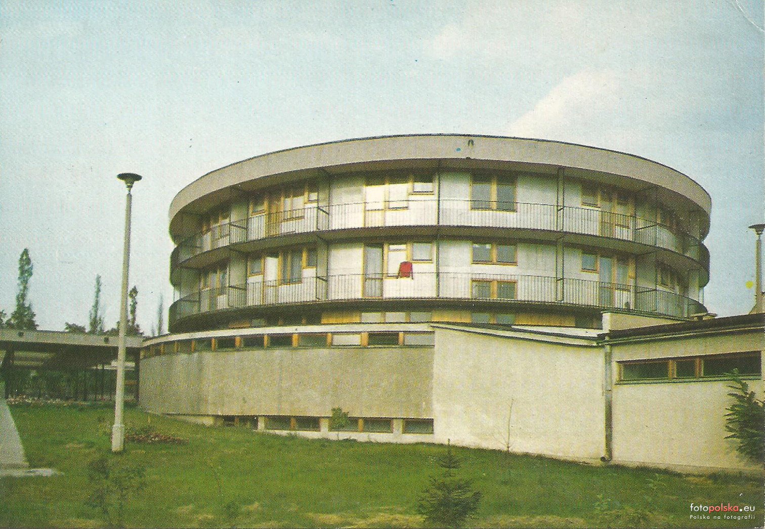 Lata 1976-1980 , Łowicz. Hotel turystyczny. Lokalizacja niepotwierdzona, jednak okrągły obiekt znajduje się przy ul. Akademickiej 1/3.Pocztówka- Krajowa Agencja Wydawnicza.Skomentuj zdjęcie