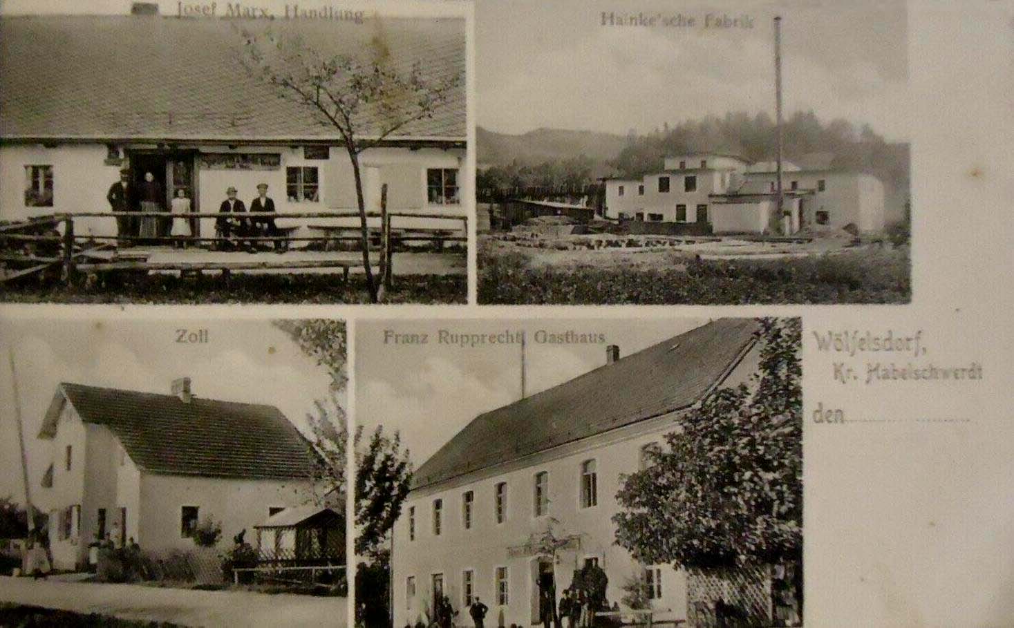 1910 , Na górnych zdjęciach budynek ze sklepem Josefa Marxa i fabryka Hainke'go, na dolnych urząd celny oraz gospoda Franza Rupprechta.Skomentuj zdjęcie