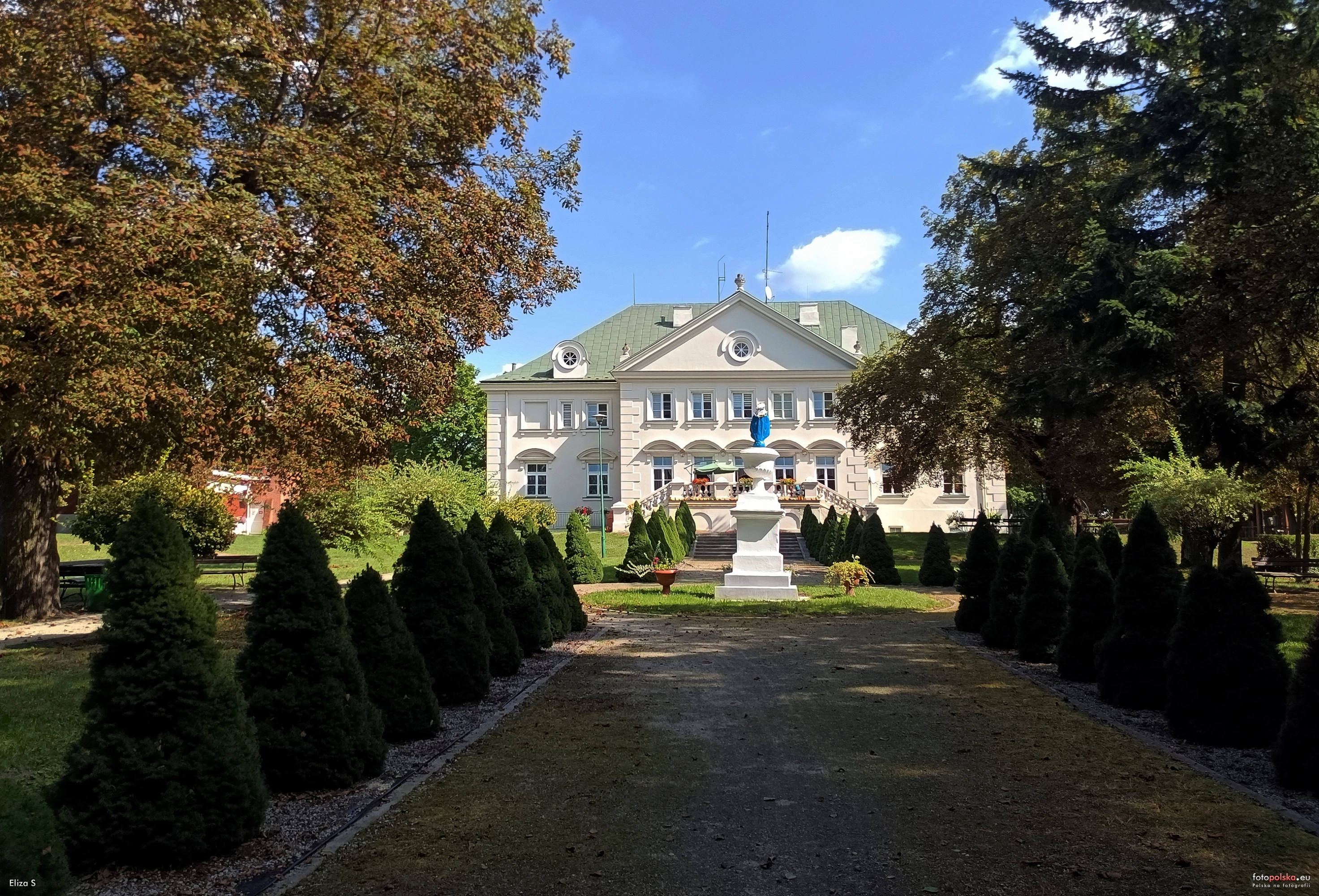 8 września 2023 , Dom Pomocy Społecznej im. hr. Eligiusza Suchodolskiego, widok na pałac z zabytkowego parku z XVIII wieku. Centralnie na zdjęciu Wazon na postumencie (kapliczka).Skomentuj zdjęcie |