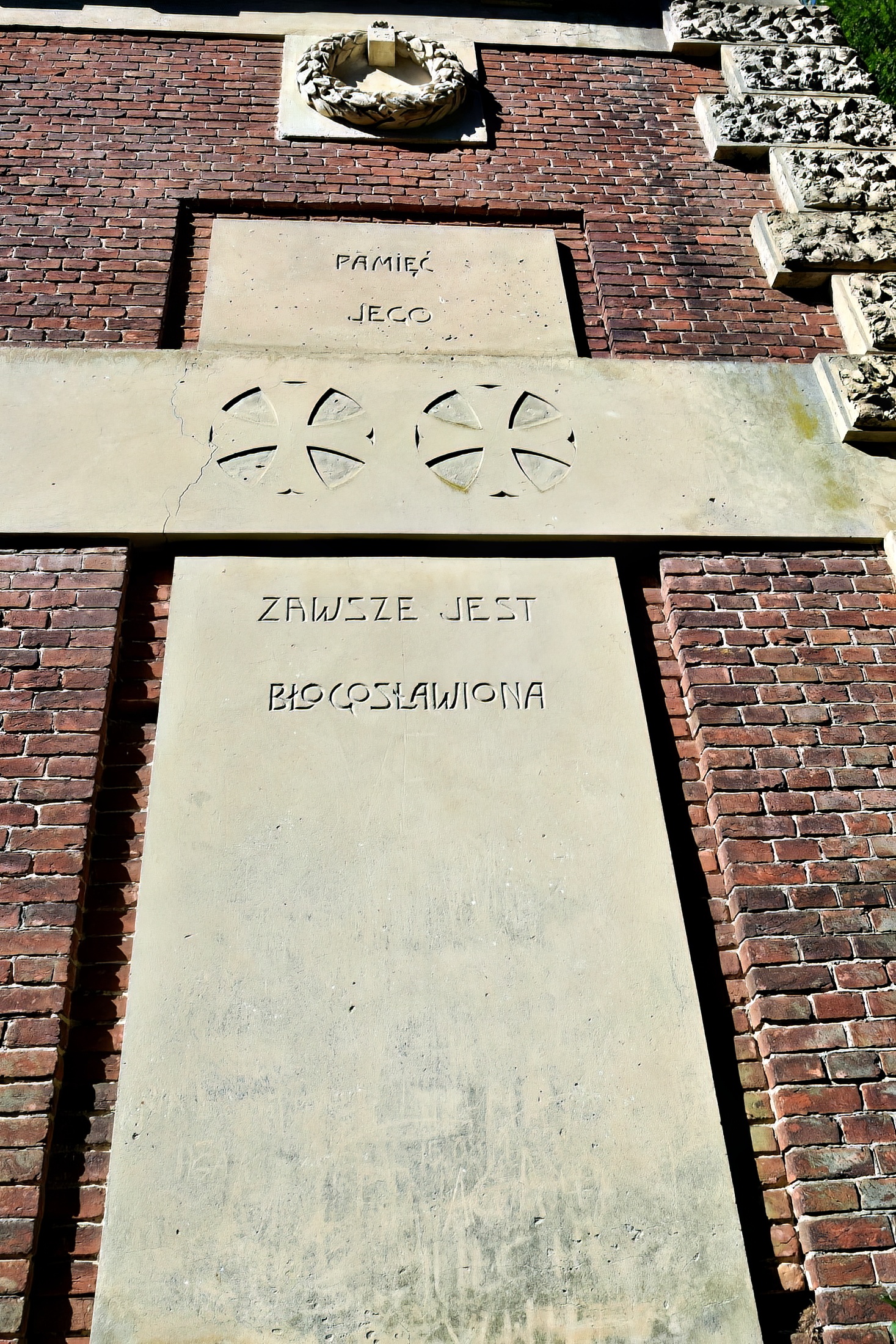 Są one połączone wspólnym ramieniem, a na nich wyryto sentencje. Ścianę frontową zdobi eliptyczne zagłębienie, płycina mieszcząca drzwi wejściowe. Nad drzwiami znajdował się dawniej piękny witraż przedstawiający Chrystusa upadającego pod krzyżem, teraz został on zniszczony a całość, wraz z drzwiami - zabita deskami. Po bokach płyciny frontowej znajdują się wspaniałe płaskorzeźby, w stylu jakby starożytnym, przypominające anioły. Za