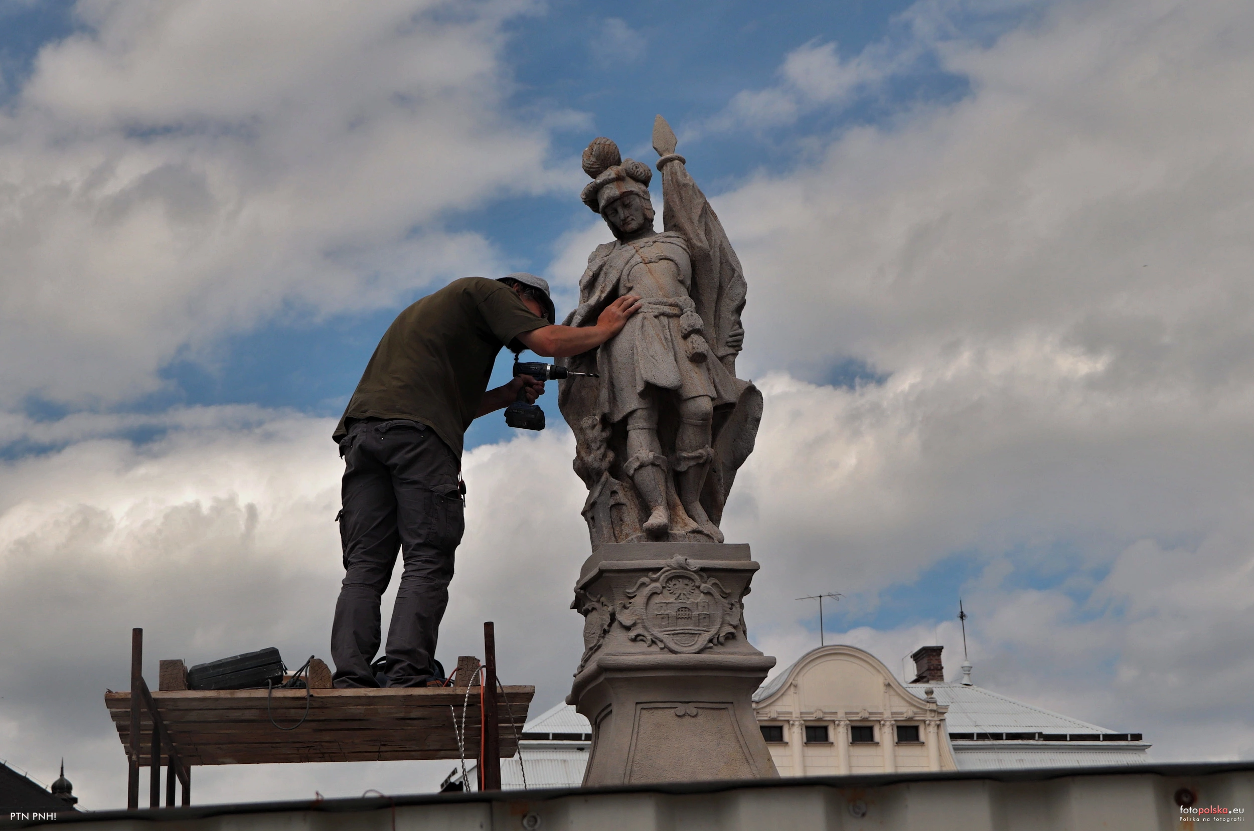31 lipca 2023 , Figura św. Floriana podczas remontu. Podczas prac na figurze się pokazalo źe prawa ręka trzymający dzbanek z wodą do gaszenia ognia jest w bardzo kiepskym stanie, więc bylo ją trzeba fachowo doklejić.Skomentuj zdjęcie
