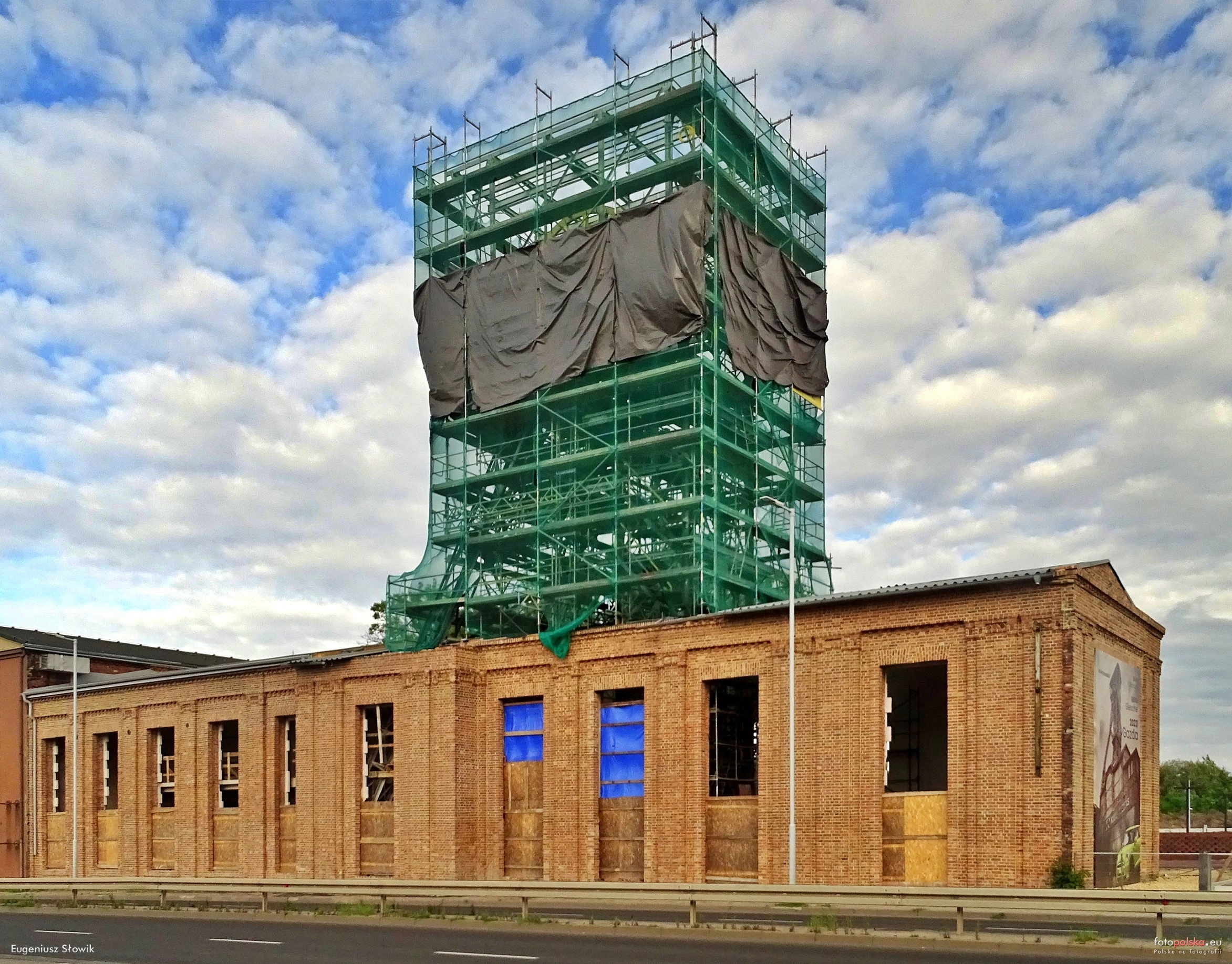 1 września 2023 , Wieża wyciągowa szybu Wschodni II, budynki nadszybia i maszynowni podczas remontu.