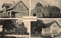 Lata 1912-1914 , Na górnych zdjęciach: dom Kubitza ze sklepem wielobranżowym i budynek masarni, na dolnych: sklep Georga Rusnoka oraz szkoła ewangelicka (po II wojnie światowej przedszkole). Kartka wysłana z Godowa 5.08.1915 r..Skomentuj zdjęcie