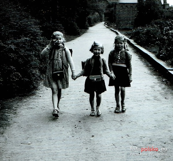 Lata 1940-1944 , Opis na zdjęciu: "Moja droga do szkoły przez Goethepark 8 (1 klasa). Po mojej prawej i lewej stronie stoją przyjaciółki ze szkoły. "Skomentuj zdjęcie