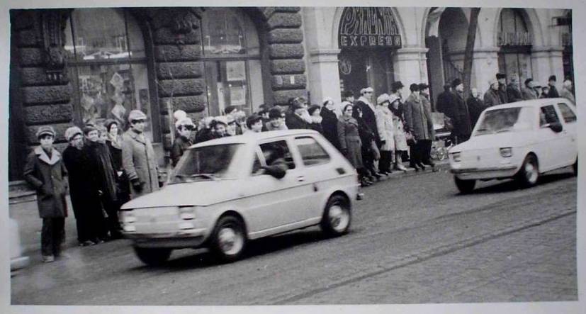 1973 , Początek gierkowskiej "rewolucji motoryzacyjnej". Pierwsze fiaty 126p w Łodzi. Najpierw defilada na Piotrkowskiej (tu na wysokości numerów 147-149), a potem kilkudniowy pokaz w Hali Sportowej |