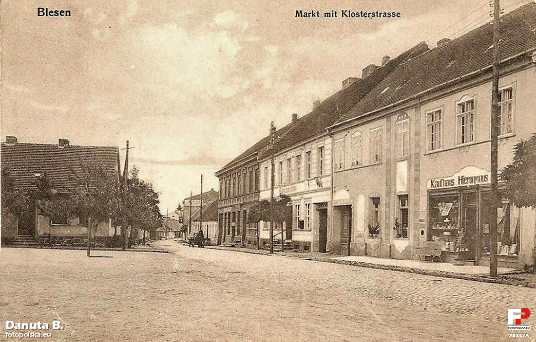 Lata 1905-1928 , Rynek w Bledzewie na pocztówce z początku XX stulecia. Fotograf stał w miejscu, gdzie dziś jest parking . Wszystkie widoczne budynki zachowały się, być może niektóre w głębi zostały przebudowane.Skomentuj zdjęcie |