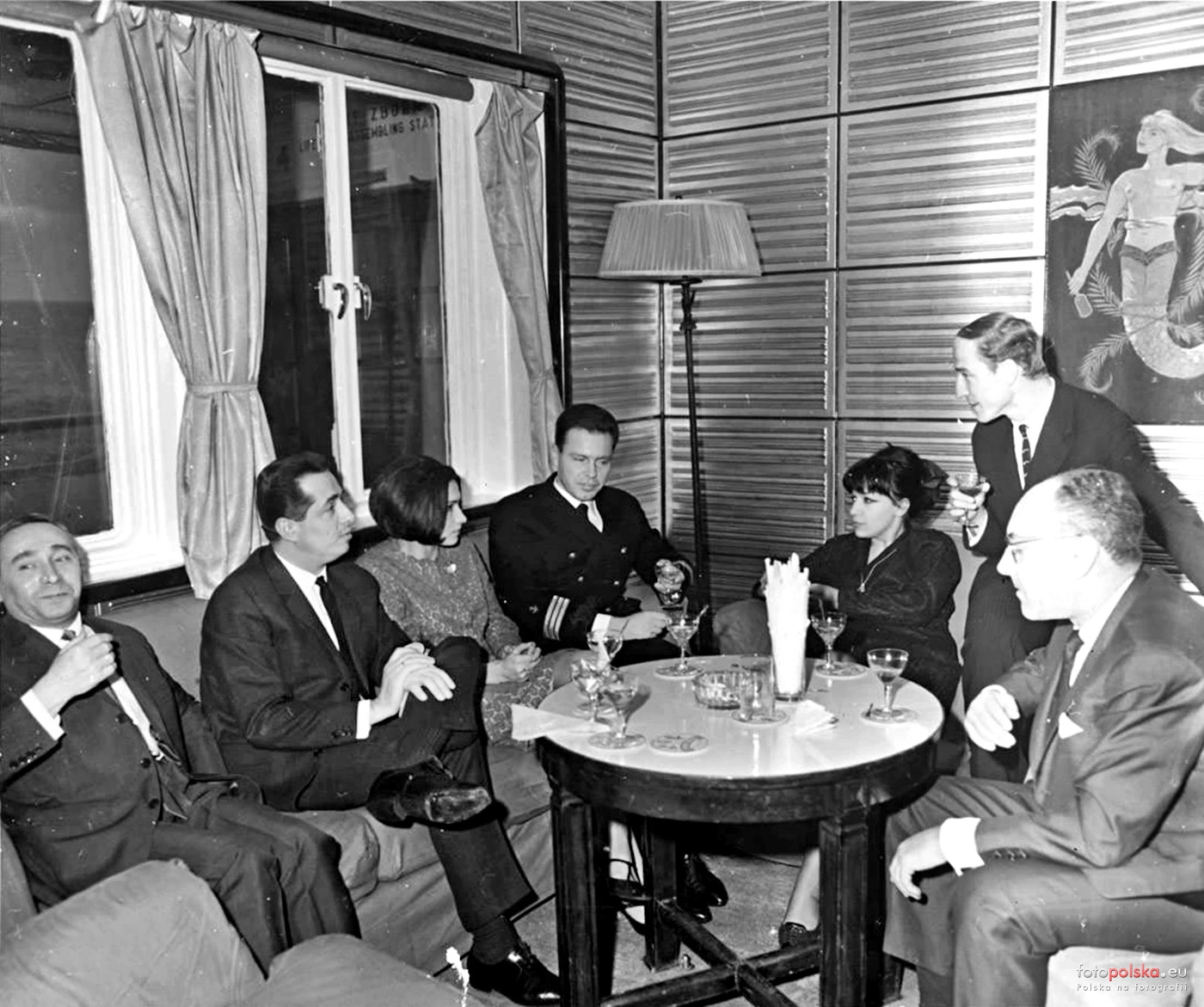 Lata 1964-1965 , Pasażerowie na pokładzie MS Batory. Widoczni m.in.: Lucjan Kydryński, Ewa Demarczyk.Skomentuj zdjęcie