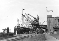 1938 , Załadunek towarów na "Batorego". Widoczny fragment Dworca Morskiego.Skomentuj zdjęcie |