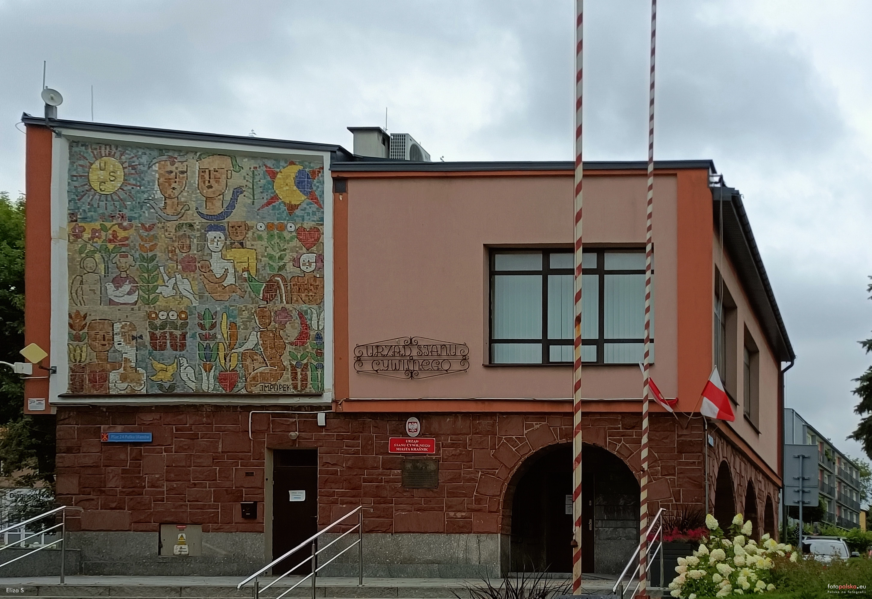 10 sierpnia 2023 , Urząd Stanu Cywilnego w Kraśniku. Z lewej strony elewacji frontowej budynku ciekawa mozaika ozdobna. Na ścianie przy głównym wejściu/wyjściu znajduje się pamiątkowa tablica.Skomentuj zdjęcie |