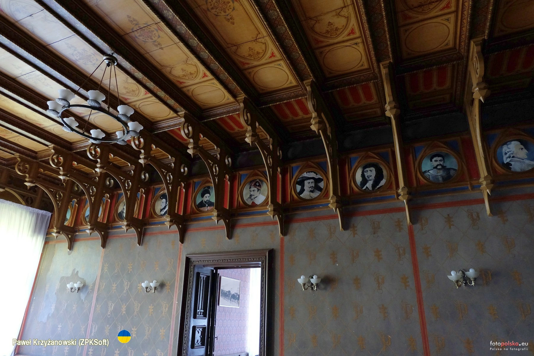 29 października 2023 , Sala Rycerska - jedno z wnętrz na parterze pałacu. Pałac powstał w 1866 r. i w dobrym stanie przetrwał wszelkie zawieruchy. Niestety w czasie II wojny światowej miał tu siedzibę komisarz Rzeszy ds. utrwalania narodowości niemieckiej i musiały zniknąć portrety królów polskich oraz zamalowano polichromie herbowe. Niemcy zniszczyli też wyposażenie. Na szczęście zachowała się wspaniała snycerka w tej sali, część ozdób odtworzono. Obecnie pałac pełni funkcję restauracyjną (parter) oraz hotelową (piętro) stąd wszechobecne stoły w każdej z sal. |