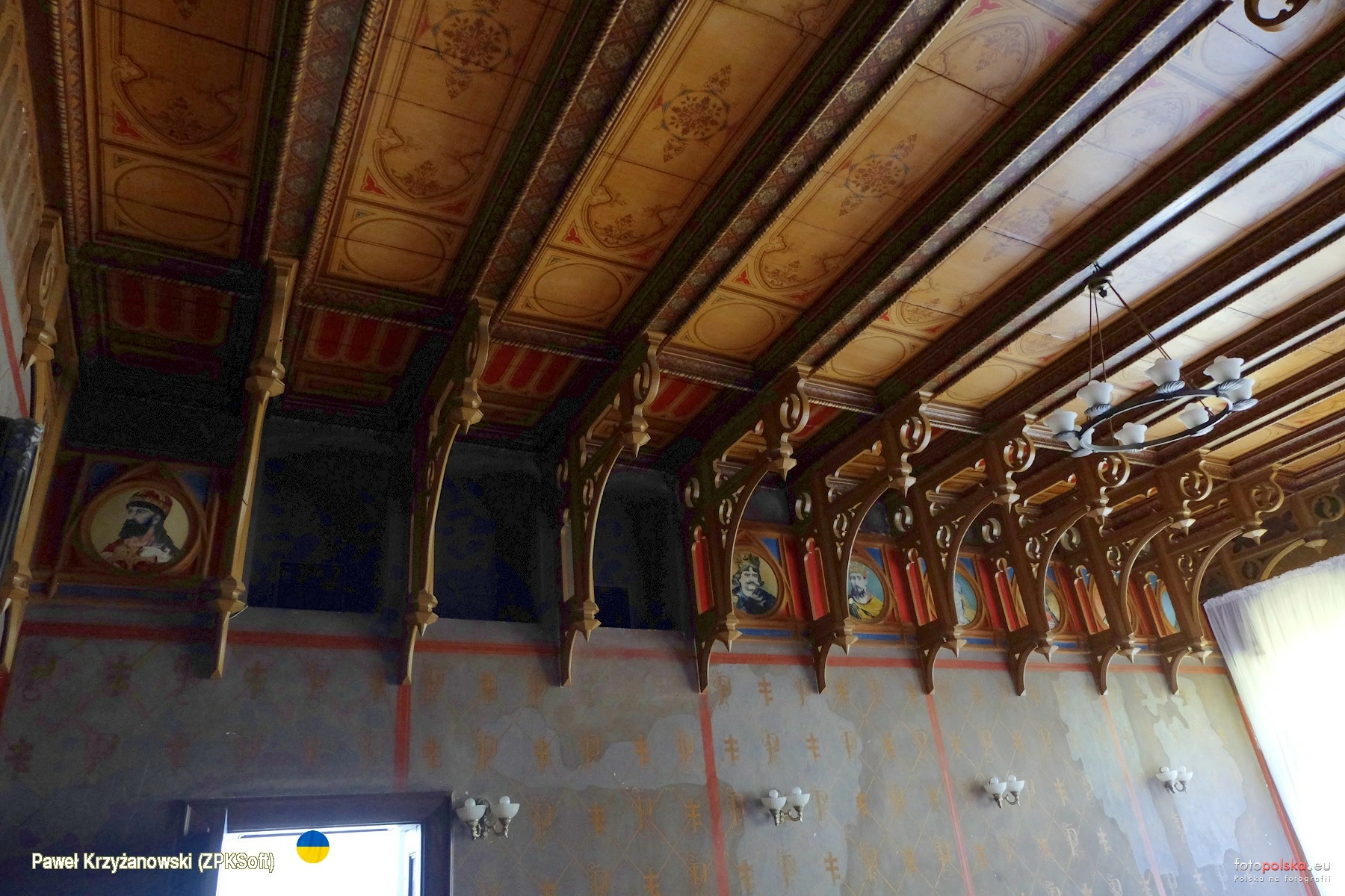29 października 2023 , Sala Rycerska - jedno z wnętrz na parterze pałacu. Pałac powstał w 1866 r. i w dobrym stanie przetrwał wszelkie zawieruchy. Niestety w czasie II wojny światowej miał tu siedzibę komisarz Rzeszy ds. utrwalania narodowości niemieckiej i musiały zniknąć portrety królów polskich oraz zamalowano polichromie herbowe. Niemcy zniszczyli też wyposażenie. Na szczęście zachowała się wspaniała snycerka w tej sali, część ozdób odtworzono. Obecnie pałac pełni funkcję restauracyjną (parter) oraz hotelową (piętro) stąd wszechobecne stoły w każdej z sal. |