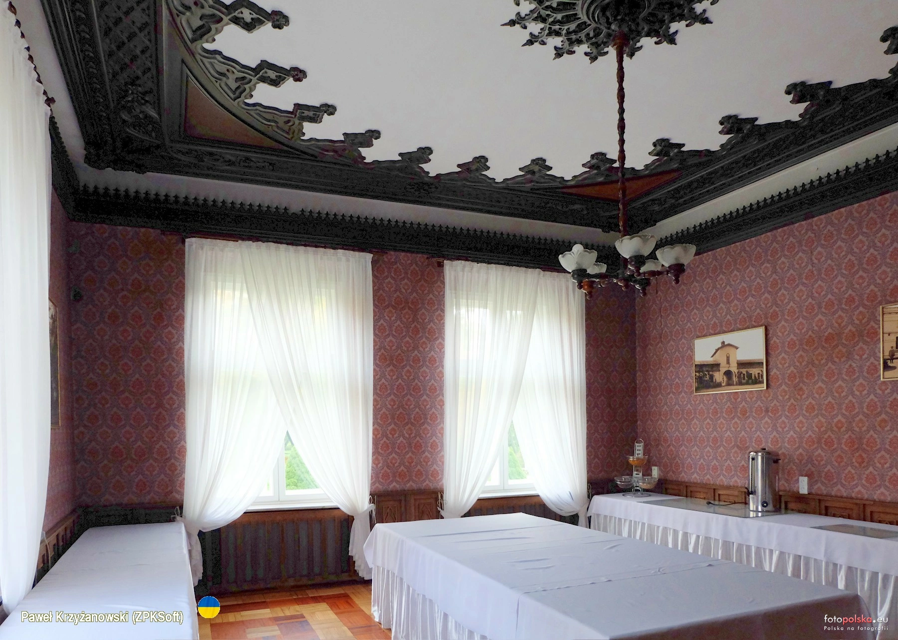 29 października 2023 , Sala współcześnie nazwana wykładową - jedno z wnętrz na parterze pałacu. Pałac powstał w 1866 r. i w dobrym stanie przetrwał wszelkie zawieruchy. Niestety w czasie II wojny światowej miał tu siedzibę komisarz Rzeszy ds. utrwalania narodowości niemieckiej i musiały zniknąć portrety królów polskich oraz zamalowano polichromie herbowe. Niemcy zniszczyli też wyposażenie. Obecnie pałac pełni funkcję restauracyjną (parter) oraz hotelową (piętro) stąd wszechobecne stoły w każdej sali. |
