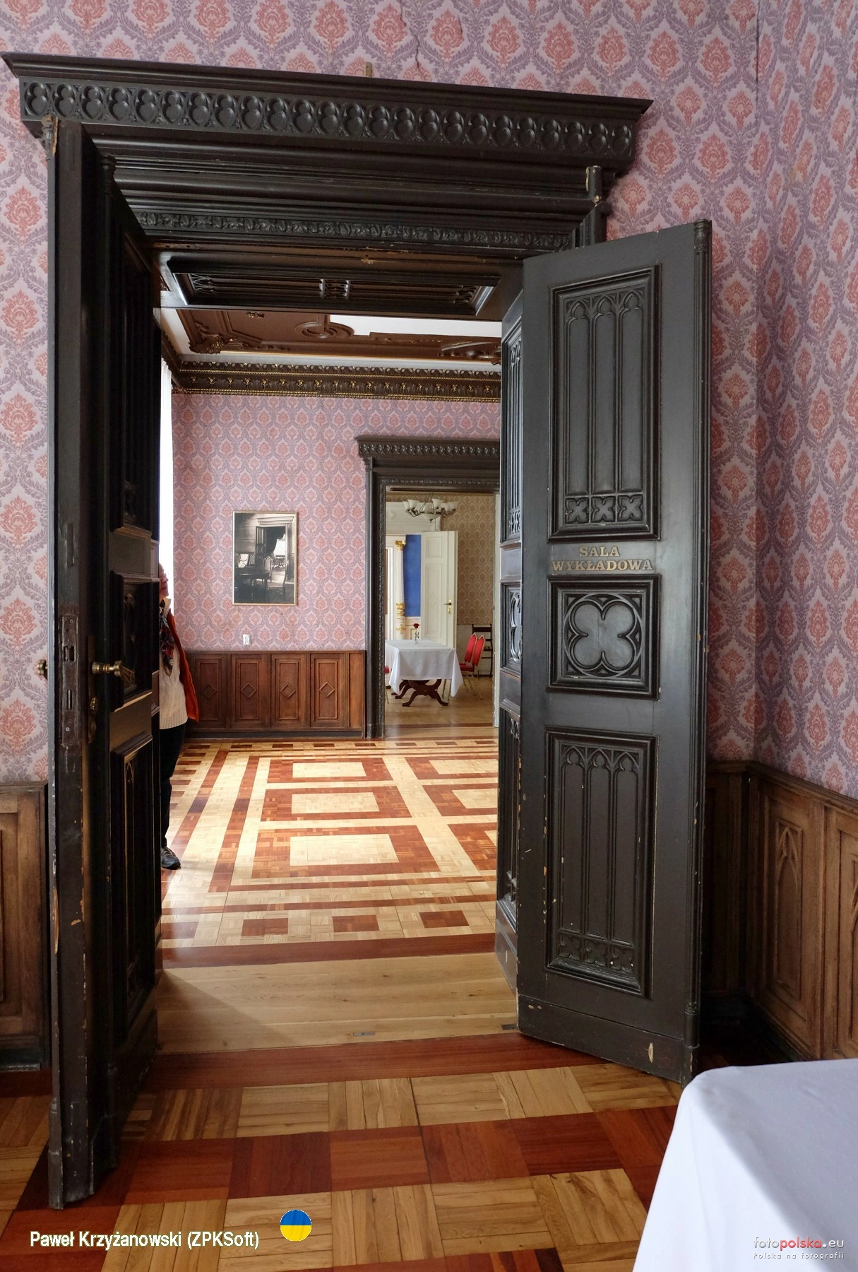 29 października 2023 , Sala współcześnie nazwana wykładową - jedno z wnętrz na parterze pałacu. Pałac powstał w 1866 r. i w dobrym stanie przetrwał wszelkie zawieruchy. Niestety w czasie II wojny światowej miał tu siedzibę komisarz Rzeszy ds. utrwalania narodowości niemieckiej i musiały zniknąć portrety królów polskich oraz zamalowano polichromie herbowe. Niemcy zniszczyli też wyposażenie. Obecnie pałac pełni funkcję restauracyjną (parter) oraz hotelową (piętro) stąd wszechobecne stoły w każdej sali. Na zdjęciu drzwi prowadzące do sali zwanej przejściową.