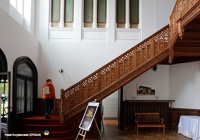29 października 2023 , Pałac powstał w 1866 r. i w dobrym stanie przetrwał wszelkie zawieruchy. Niestety w czasie II wojny światowej miał tu siedzibę komisarz Rzeszy ds. utrwalania narodowości niemieckiej i musiały zniknąć portrety królów polskich oraz zamalowano polichromie herbowe. Niemcy zniszczyli też wyposażenie. Na szczęście zachowała się stolarka okienna i drzwiowa, detale snycerskie i sztukaterie. Na zdjęciu westybul ze schodami na drugą kondygnację, to chyba najciekawsze pomieszczenie jakie zobaczyliśmy w pałacu. Wprawne oko dostrzeże w balustradzie zwielokrotniony herb Potockich. |