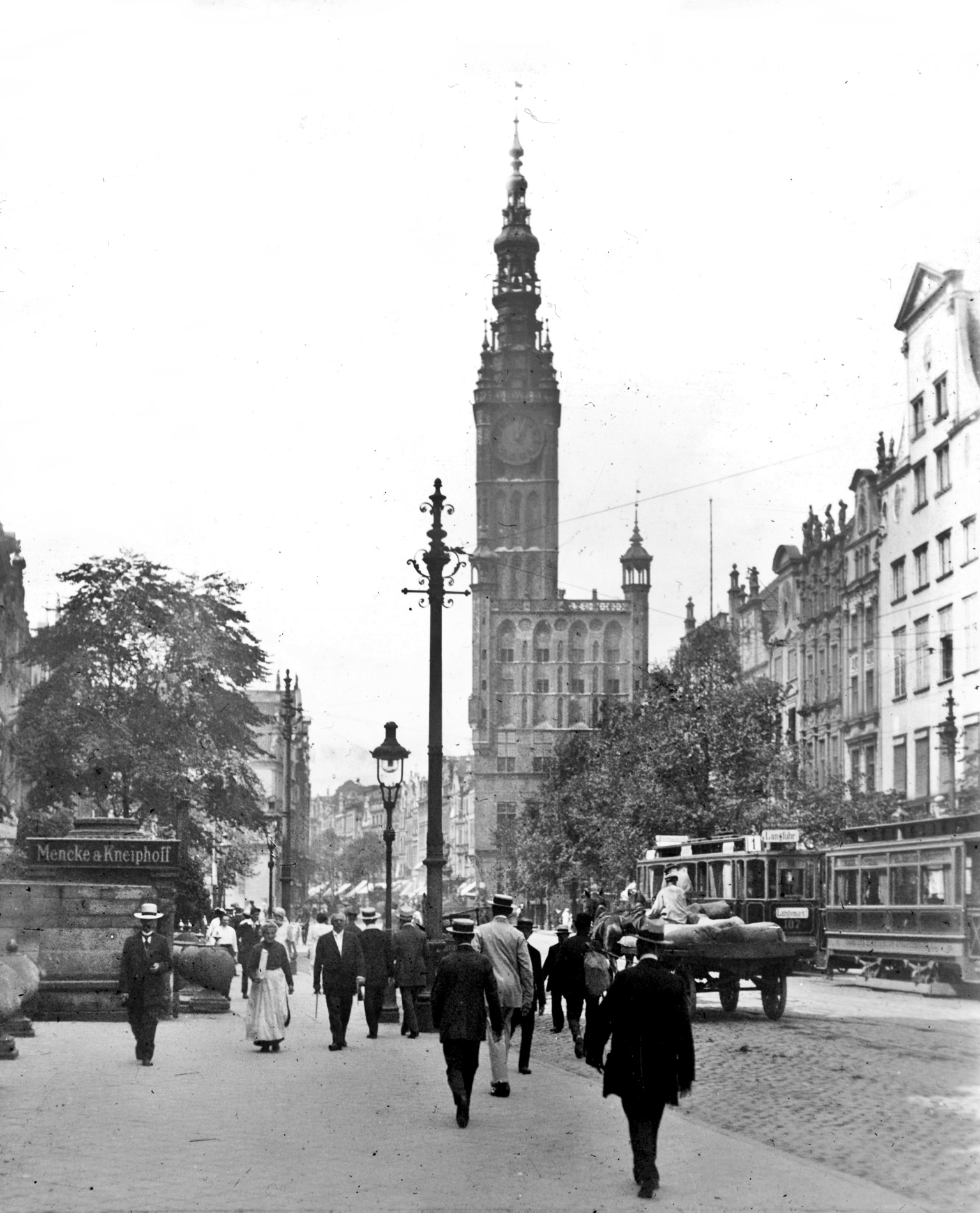 1914 , Długi Targ w ujęciu od strony Bramy Zielonej, w głbi widoczny Ratusz.Skomentuj zdjęcie |