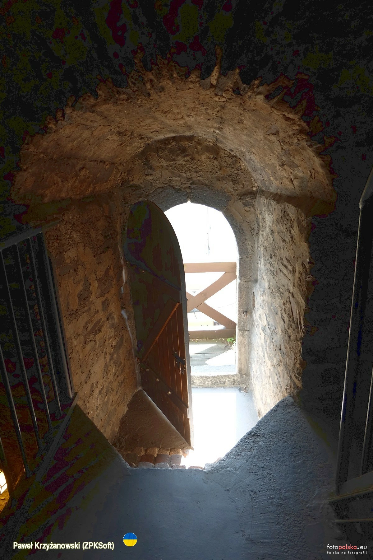 23 sierpnia 2023 , Wnętrze wieży Bramy Wrocławskiej, jednej z czterech bram w ciągu murów murów miejskich Paczkowa, wzniesionych w w poł. XIV w. Wieża w większości kamienna o wysokości ok. 30 m, siedmiokondygnacyjna, zwieńczona krenelażem i przykryta hełmem ceglanym. Aby dostać się na samą górę gdzie jest punkt widokowy trzeba się trochę natuptać ;-) Na zdjęciu wejście na niewielki balkonik od strony południowej.Skomentuj zdjęcie |