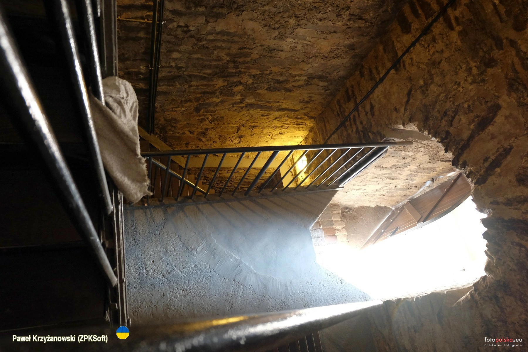 23 sierpnia 2023 , Wnętrze wieży Bramy Wrocławskiej, jednej z czterech bram w ciągu murów murów miejskich Paczkowa, wzniesionych w w poł. XIV w. Wieża w większości kamienna o wysokości ok. 30 m, siedmiokondygnacyjna, zwieńczona krenelażem i przykryta hełmem ceglanym. Aby dostać się na samą górę gdzie jest punkt widokowy trzeba się trochę natuptać ;-) Na zdjęciu spojrzenie z góry na drzwi prowadzące na niewielki balkonik od strony południowej.Skomentuj zdjęcie |