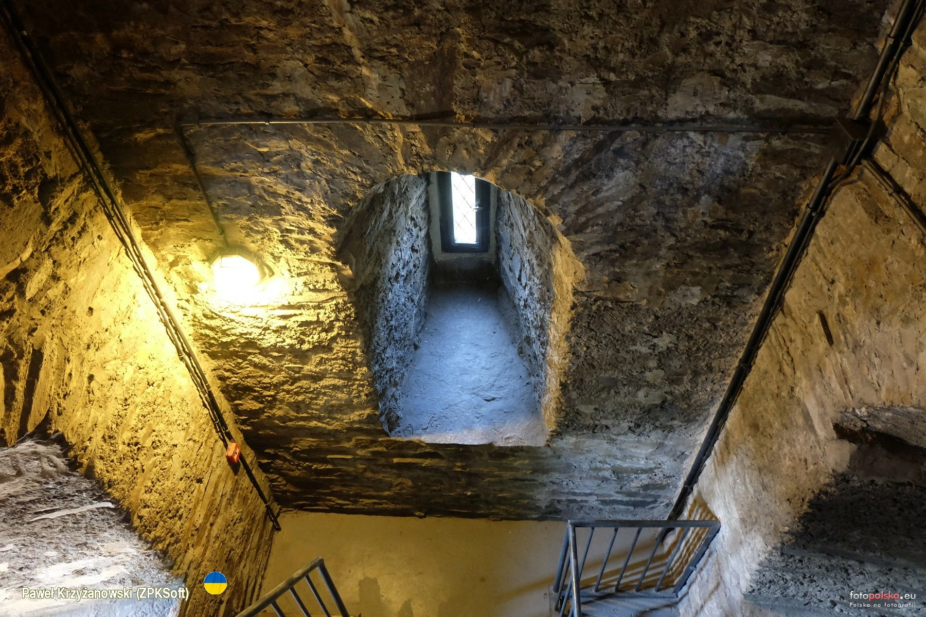 23 sierpnia 2023 , Wnętrze wieży Bramy Wrocławskiej, jednej z czterech bram w ciągu murów murów miejskich Paczkowa, wzniesionych w w poł. XIV w. Wieża w większości kamienna o wysokości ok. 30 m, siedmiokondygnacyjna, zwieńczona krenelażem i przykryta hełmem ceglanym. Aby dostać się na samą górę gdzie jest punkt widokowy trzeba się trochę natuptać ;-) Okienka na 4 i 5 poziomie są w formie strzelnic.Skomentuj zdjęcie |