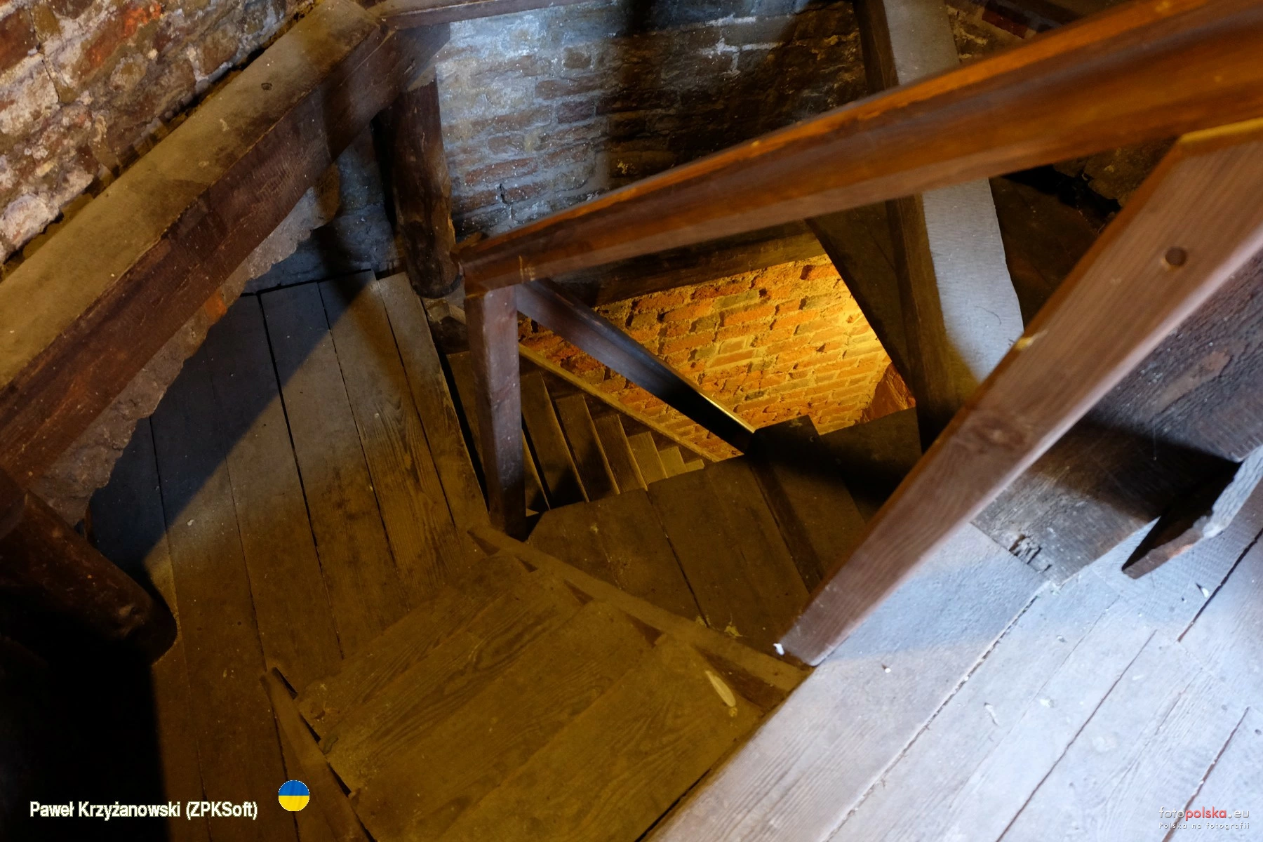 23 sierpnia 2023 , Wnętrze wieży Bramy Wrocławskiej, jednej z czterech bram w ciągu murów murów miejskich Paczkowa, wzniesionych w w poł. XIV w. Wieża kamienna o wysokości ok. 30 m, siedmiokondygnacyjna, zwieńczona krenelażem i przykryta hełmem ceglanym. Aby dostać się na samą górę gdzie jest punkt widokowy trzeba się trochę natuptać ;-) Na zdjęciu fragment drewnianych schodów.Skomentuj zdjęcie |