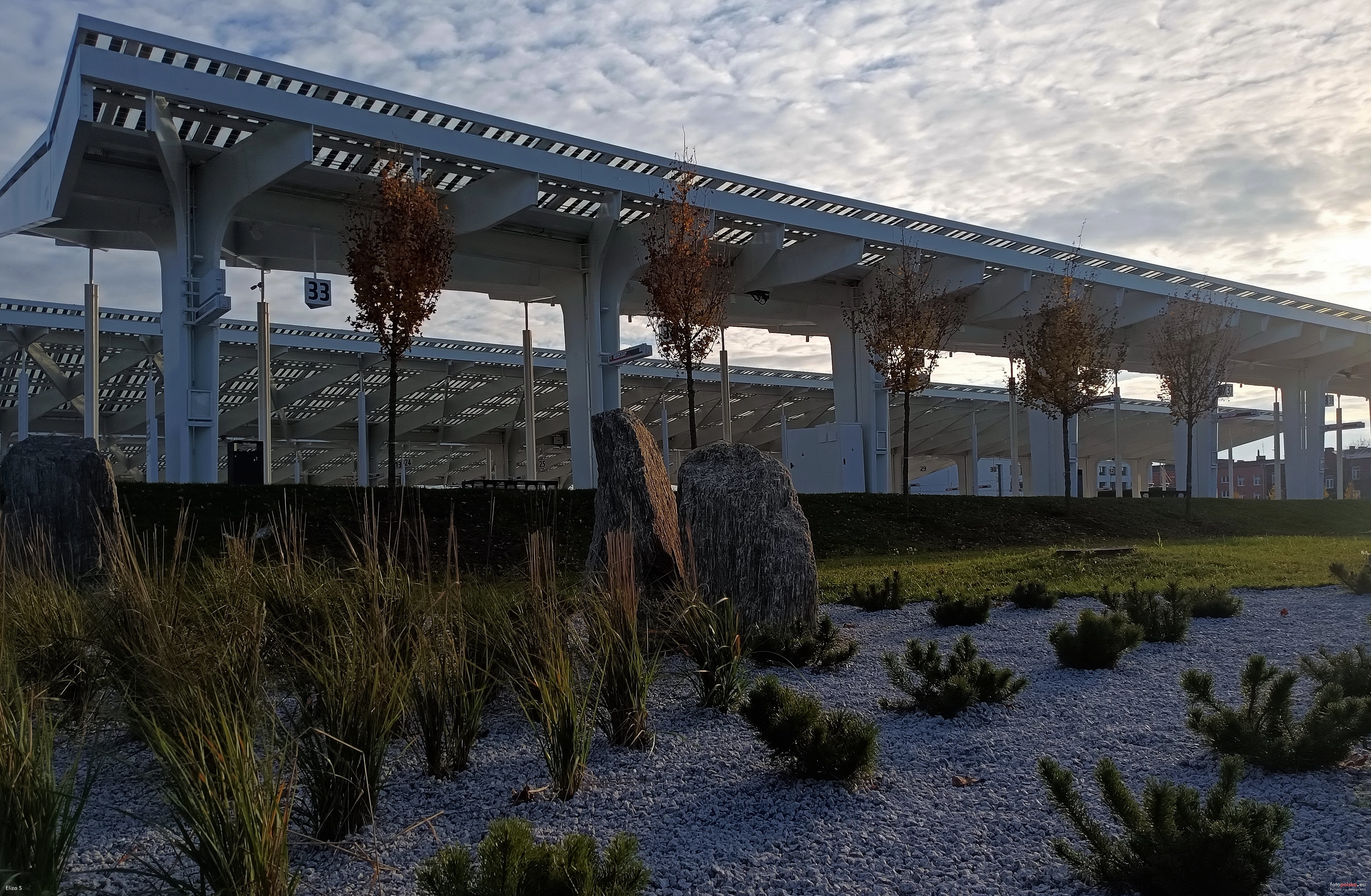 13 listopada 2023 , Dworzec Lublin, stanowiska autobusowe. Na pierwszym planie aranżacja zieleni między peronami stanowisk autobusowych i ul. Młyńską.Skomentuj zdjęcie