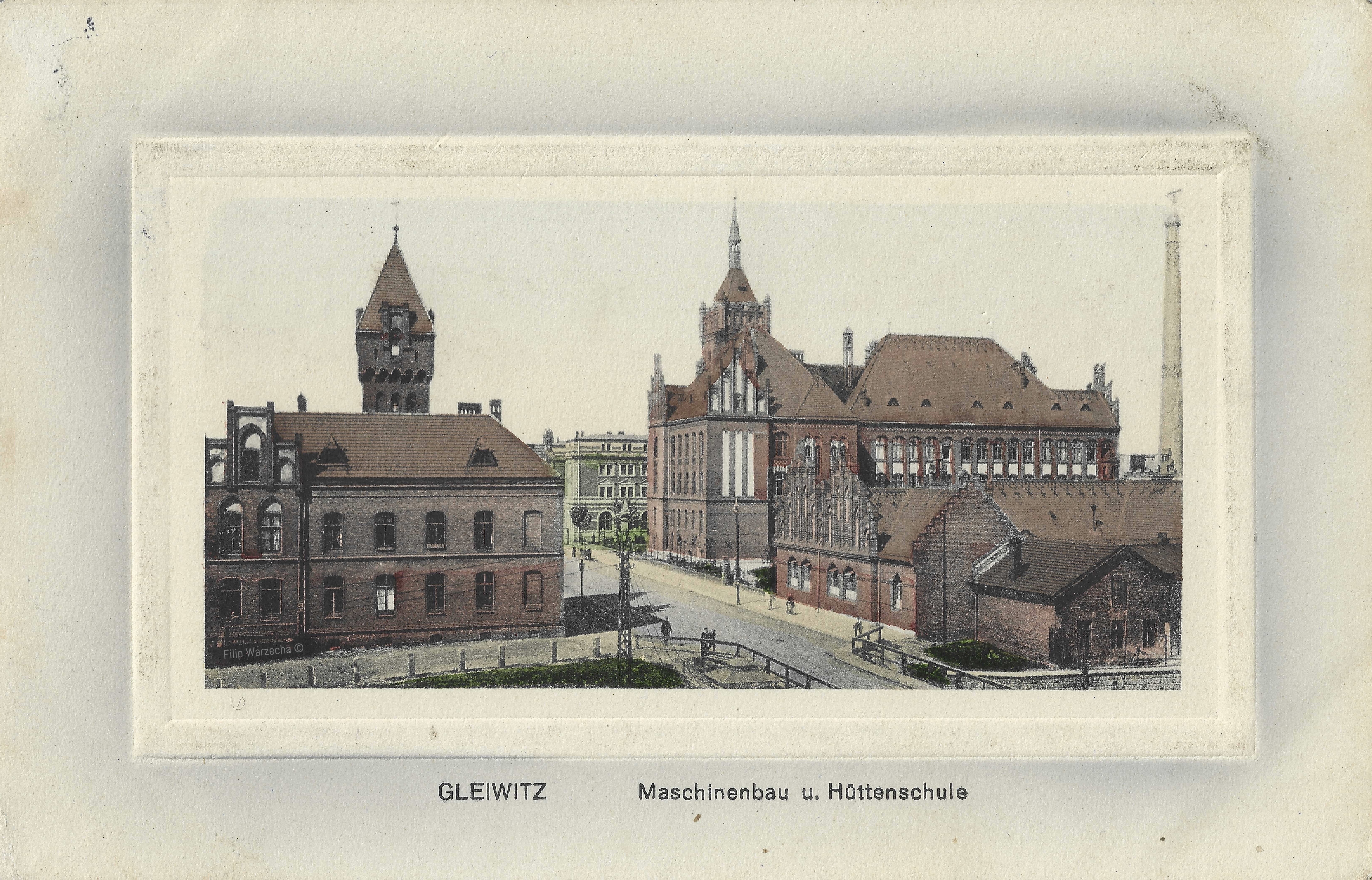 1914 , Gliwice - po prawej stronie Królewska Szkoła Budowy Maszyn i Hutnictwa (Maschinenbau u. Hüttenschule) widziana od strony ulicy Wrocławskiej oraz budynek straży pożarnej.Skomentuj zdjęcie |