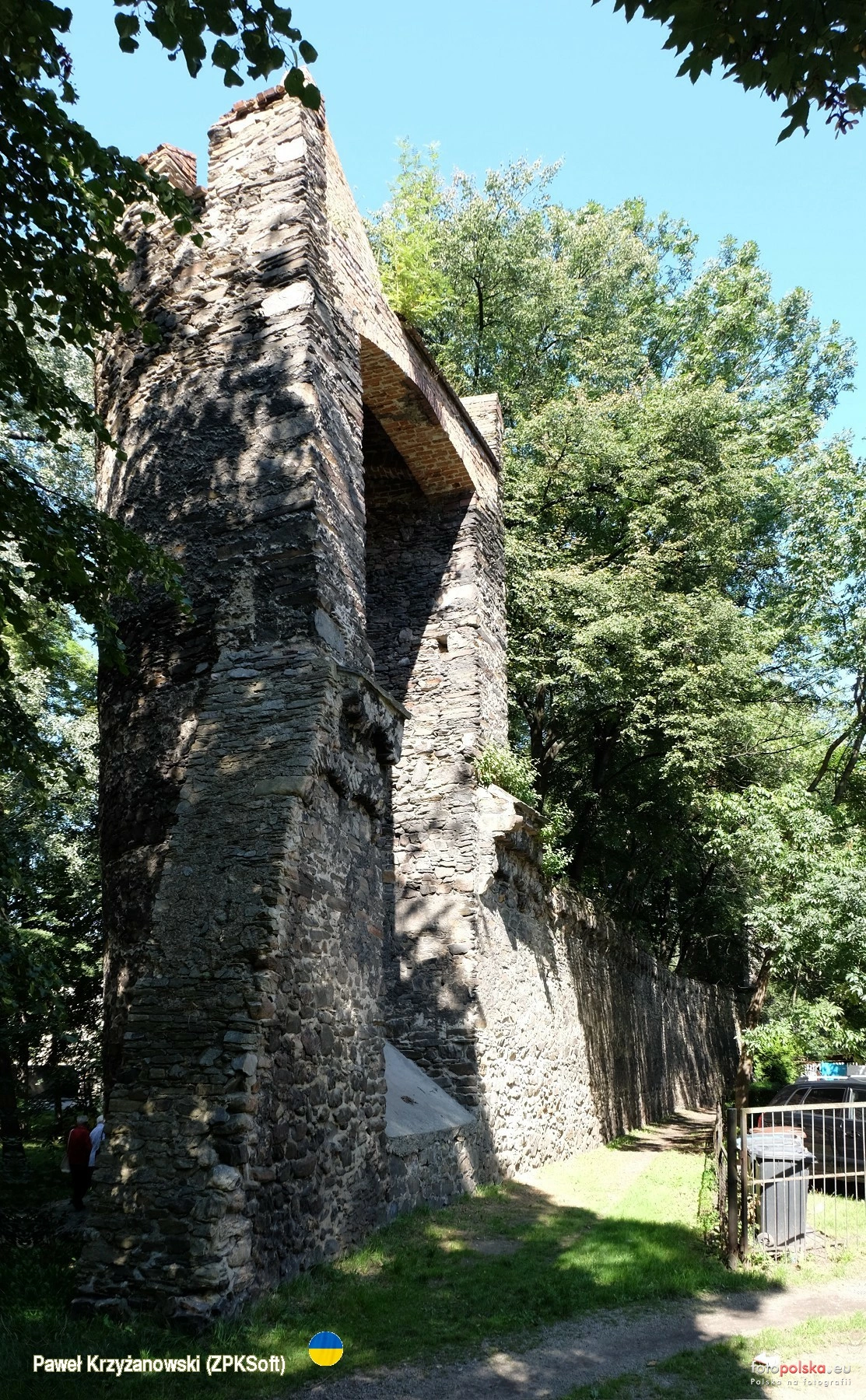 7 września 2023 , Mury obronne Paczkowa mają eliptyczny, regularny zarys i mierzą 1200 m w obwodzie, miejscami wysokie na 7 metrów ( pierwotnie 9 m), zbudowane z kamienia łamanego. Wzniesione ok. 1350 r. z nakazu biskupa Przecława z Pogorzeli. Przez wieki burzone i wznoszone ponownie, w XVI w. powstał drugi, niepełny pierścień obwarowań zewnętrznych, rozebrany w 1846 r. Między odcinkami muru osadzono cztery wieże oraz 24 baszty, z których do dziś zachowało się 19. W miejscu zasypanej fosy stworzono planty, zadrzewione dziś miejsca spacerów i wypoczynku. Na zdjęciu baszta łupinowa na odcinku przy ul. Kołłątaja. Dalej w lewo mury zostały rozebrane w XIX w. w związku z budową m.in. szkoły.Skomentuj zdjęcie |