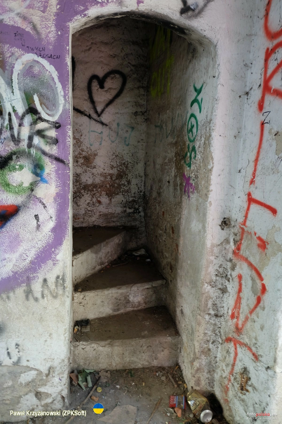 7 września 2023 , Cmentarny kościół św. Jana Ewangelisty powstał w l. 1604-1606 w stylu renesansowym, murowany z kamienia i cegły. Zniszczony pod koniec II wojny światowej, pozostała wieża bez hełmu i obwód murów nawy do wysokości ok. 2 m. Na zdjęciu wejście z przedsionka na wieżę.Skomentuj zdjęcie |