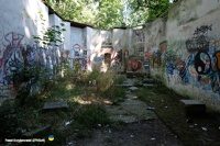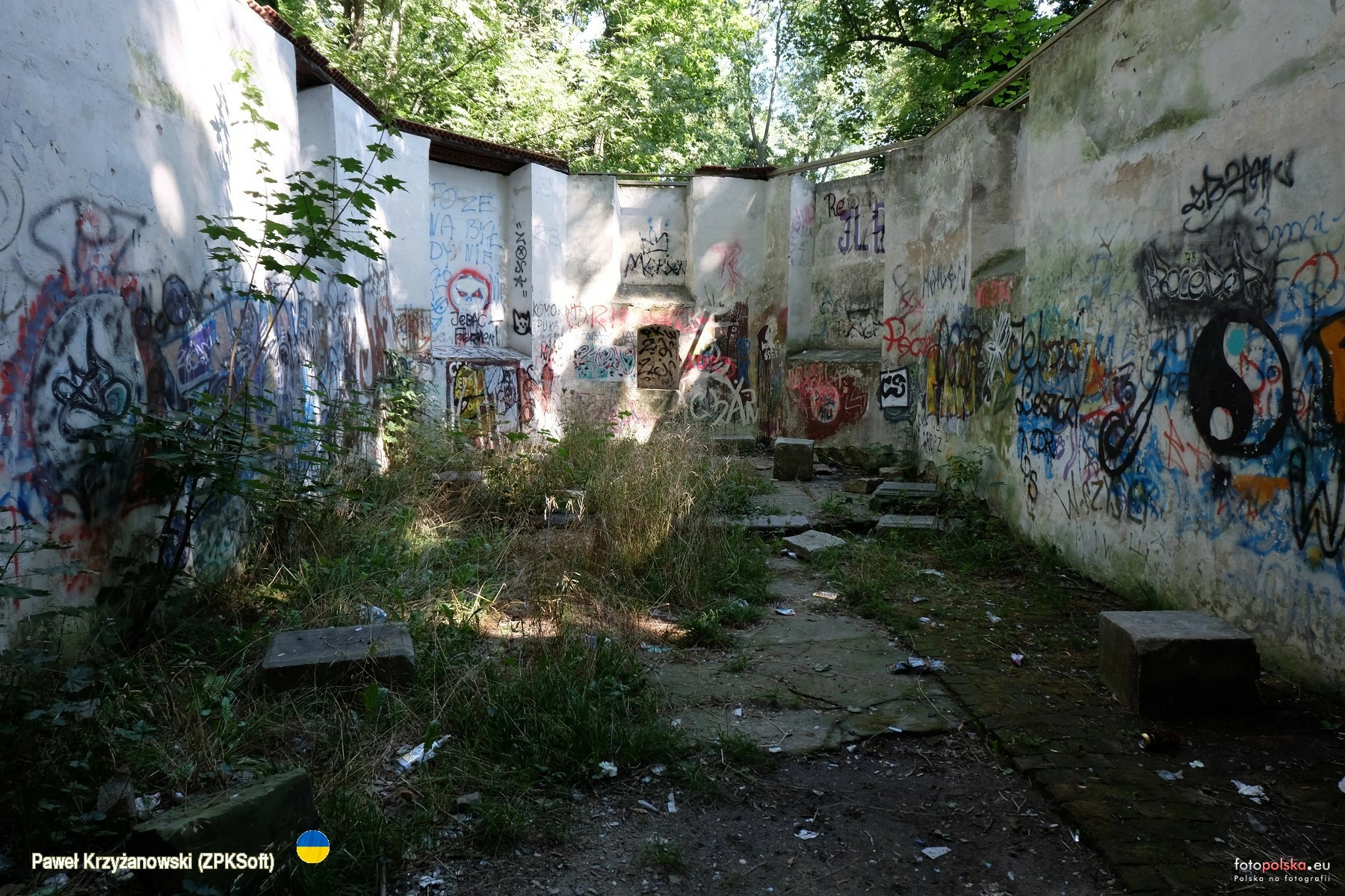 7 września 2023 , Cmentarny kościół św. Jana Ewangelisty powstał w l. 1604-1606 w stylu renesansowym, murowany z kamienia i cegły. Zniszczony pod koniec II wojny światowej, pozostała wieża bez hełmu i obwód murów nawy do wysokości ok. 2 m. Na zdjęciu wnętrze nawy w kierunku dawnego ołtarza. Przechodząc mijamy leżące płyty nagrobne i resztki kamiennych detali.Skomentuj zdjęcie |