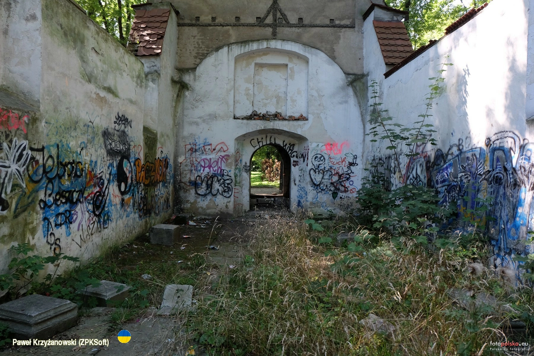 7 września 2023 , Cmentarny kościół św. Jana Ewangelisty powstał w l. 1604-1606 w stylu renesansowym, murowany z kamienia i cegły. Zniszczony pod koniec II wojny światowej, pozostała wieża bez hełmu i obwód murów nawy do wysokości ok. 2 m. Na zdjęciu wnętrze nawy w kierunku zachodnim, w stronę wieży. Przechodząc mijamy leżące płyty nagrobne i resztki kamiennych detali.Skomentuj zdjęcie |