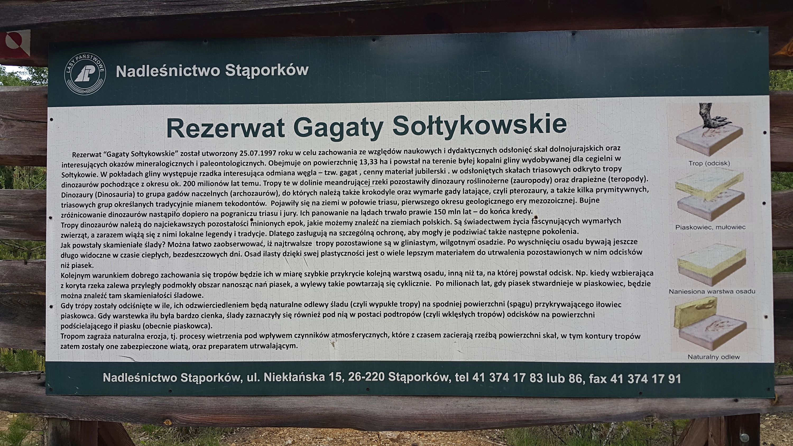 0 pobrań 665 odsłon 0 średnia ocen Poprzednie i następne zdjęcia Mariusz Ucig Obiekty widoczne na zdjęciu Rezerwat przyrody Gagaty Sołtykowskie więcej zdjęć (28) Atrakcja turystyczna Zbudowano: 1997 Panorama obiektu - />Obszar rezerwatu znajduje się w lasach Koneckich, około 1 km na południowy wschód od wsi Murawki, w pobliżu linii kolejowej Końskie – Skarżysko. Powierzchnia udostępniona to 13,74 ha. Rezerwat utworzono w 1997 roku pod nazwą „Gagaty Sołtysowskie”. Swoją powierzchnią obejmuje nieczynną od 1977 roku kopalnię odkrywkową glin ceramicznych wydobywanych dl pobliskiej cegielni w Sołtykowie. Nazwę swoją rezerwat zawdzięcza rzadkiej odmianie węgla, jaką ty pozyskiwano a mianowicie – gagat. Rezerwat jest jednym z niewielu w Polsce z tak wyraźnie zachowanymi odciskani roślin kopalnianych oraz zwierząt sprzed ponad 200 mln lat. Wśród znalezionej tam odciski i pozostałości małży słodkowodnych, organizmów bezkręgowych, ślimaków, owadów, stawonogów a także ślady gryzienia materiału roślinnego. Największą jednak frajdę dla zwiedzających stanowią zachowane i dość dobrze widoczne ślady kręgowców zachowane na terenie rezerwatu a także w okolicach. Wśród nich znaleźć można tropy zauropodów, teropodów, zallozaurów, dilofozaurów. Po za śladami dinozaurów i bezkręgowców rezerwat Chojnie obdarzył nas także skałami i minerałami występujących dziś w unikatowych formach. Część z nich niestety została bezpowrotnie zniszczona lub wyeksploatowana podczas intensywnej, dzikiej eksploatacji terenu (piryt, markasyt, galena) |