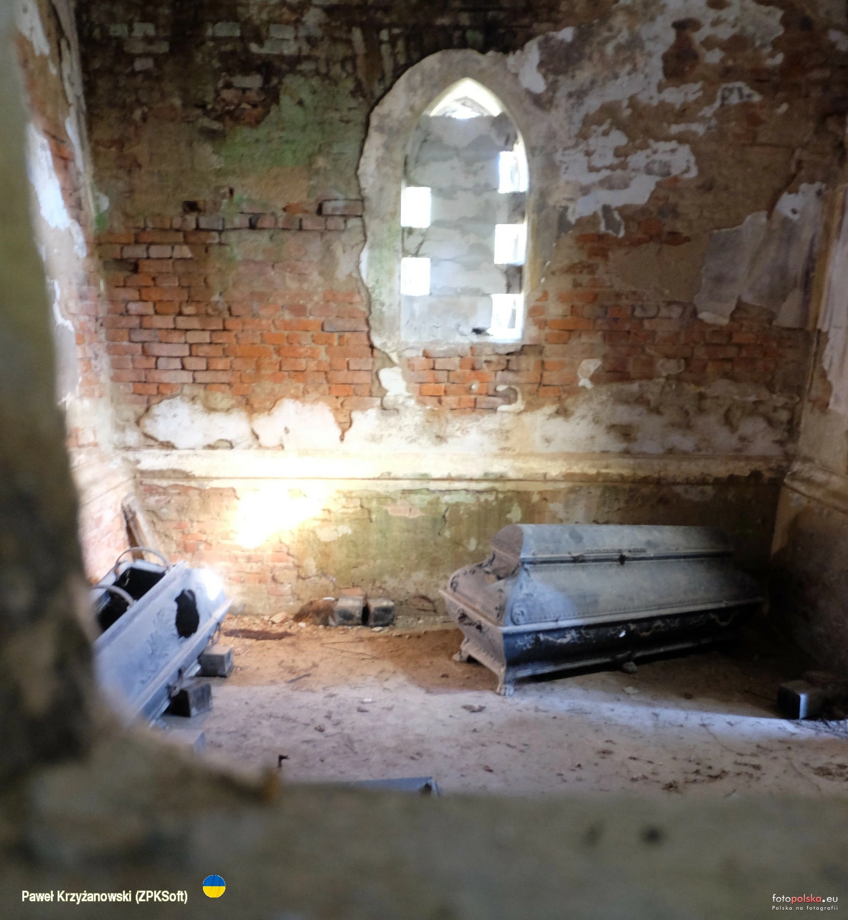 7 września 2023 , Wnętrze mauzoleum rodziny von der Rocke-Volmerstein. Foto przez szparę w zamurowanym oknie. Widać zdewastowane trumny.Skomentuj zdjęcie |