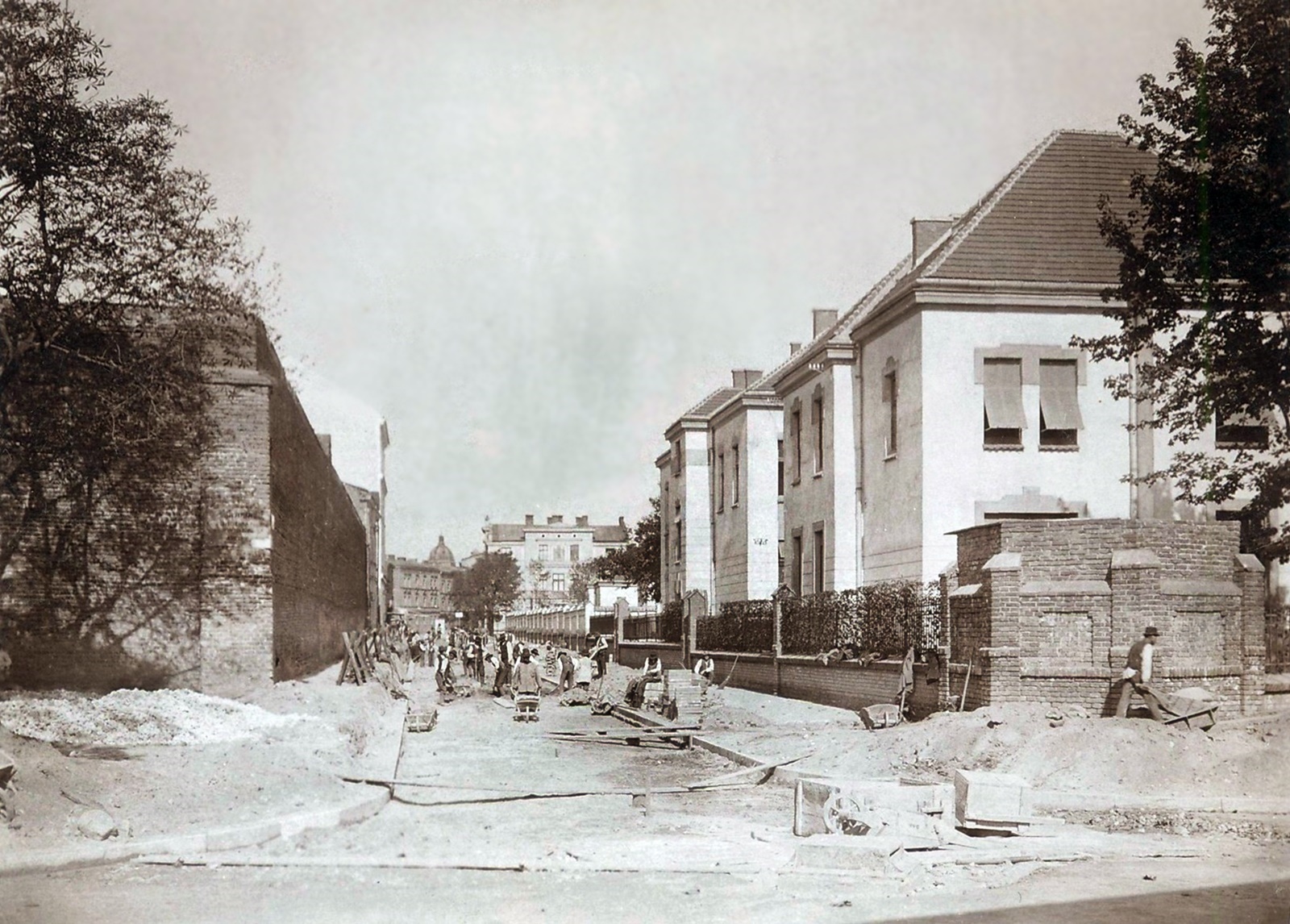 1911 , Perspektywa ulicy Botanicznej, w trakcie prac modernizacyjnych wiosną. Po prawej stronie ujęcia widoczny fragment kliniki neurologiczno-psychiatrycznej UJ, w tle elewacja frontowa domu przy Lubicz nr 44, który został wybudowany w latach 1874–1875 według projektu Maksymiliana Nitscha.Skomentuj zdjęcie |