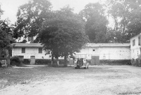 czerwiec 1990 , Wschodnie elewacje budynków stajni oraz częściowo widoczny budynek wozowni. Do dzisiaj istnieje tylko południowy (po lewej) budynek.Skomentuj zdjęcie |