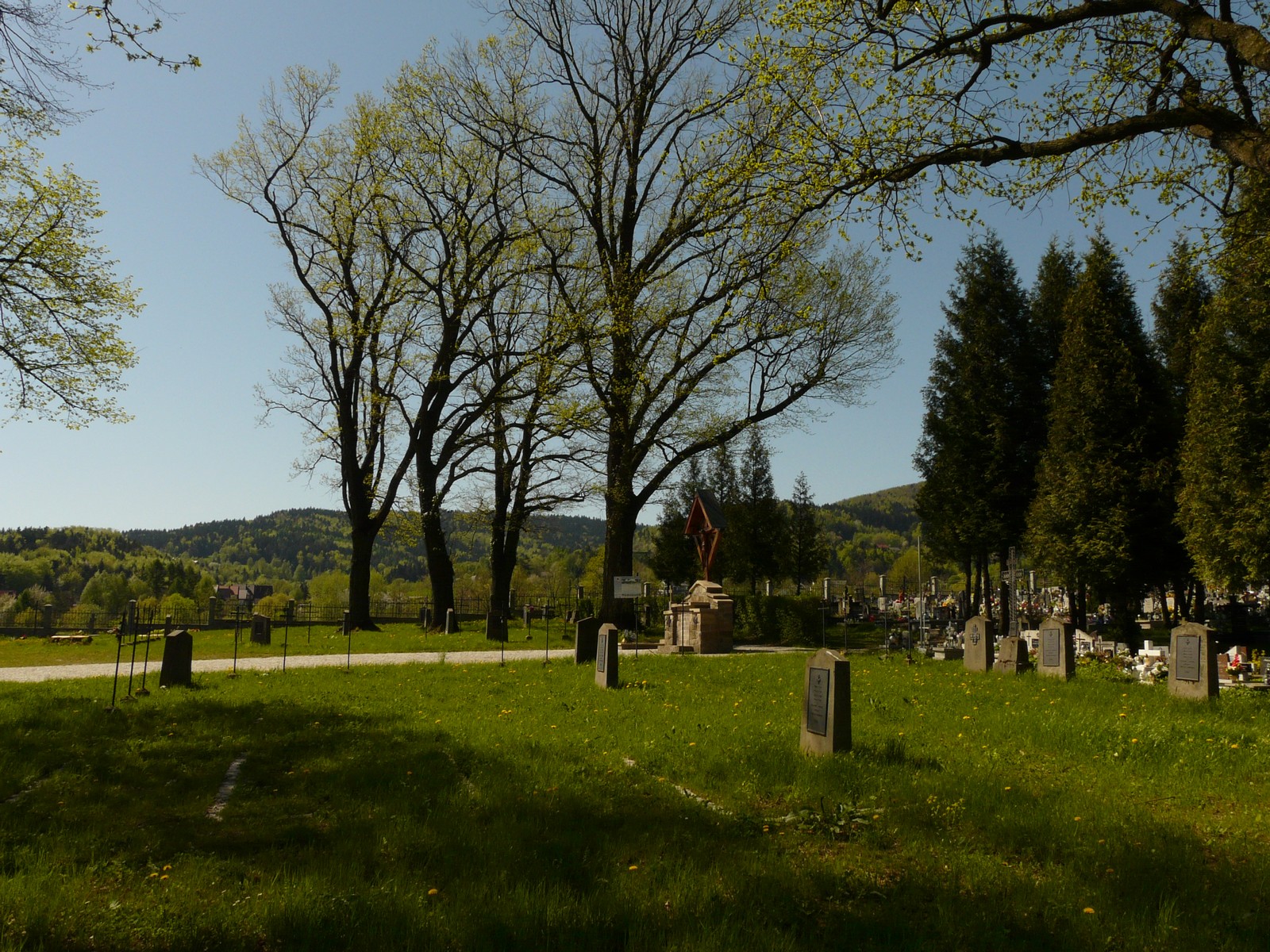 Cmentarz wojenny nr 302 więcej zdjęć (19) Architekt: Franz Stark Zbudowano: 1914 Zabytek: A-377 z 25.01.1994 Ten cmentarz ulokowano w środkowej części cmentarza parafialnego, na wzgórku, w odległości 400 m od kościoła. Przy dróżce na cmentarz, na mostku nad Sanką, słup informacyjny. Złożono tu 22 Austriaków z 58, 83 i 95 pułku piechoty, 18, 33 i 35 pułku piechoty landwery, 24 i 29 batalionu strzelców polowych; 152 Niemców z 217, 218, 219 i 220 pruskiego rezerwowego pułku piechoty; 102 Rosjan z 50, 147, 292 i 296 pułku piechoty. 109 mogił pojedynczych, 54 zbiorowe. Daty śmierci: 1914. Projektował Franz Stark. Duża kwatera wojenna na planie prostokąta. Obecnie nie ma ogrodzenia, jego dawny zasięg wskazują rzędy starych drzew. Po ostatnim remoncie jest tu 13 wydłużonych mogił zbiorowych, ustawionych poprzecznie do alei i ujętych w betonowe krawężniki. Na większości betonowe stele z żeliwnymi tablicami imiennymi, na pozostałych krzyże żeliwne i listwowe dwóch typów. Na osi cmentarza stylizowany ołtarz polowy z dwuspadowym zwieńczeniem, a na nim drewniany krzyż łaciński. Pod nim tablica z napisem:"Z szarej codzienności przybyliśmy; przez próg życia odeszliśmy ze skroniami zwieńczonymi laurem". Powierzchnia 276 m2. Stan dobry. źródło: Nazwiska pochowanych są na stronie Cmentarz parafialny więcej zdjęć (6) |