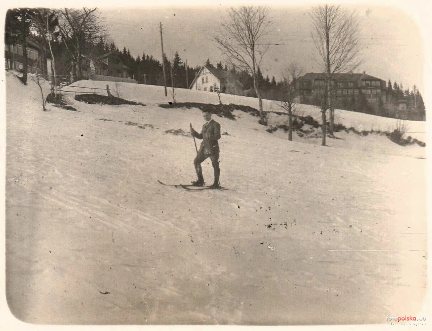 styczeń 1927 , Karpacz, okolica górnego odcinka dzisiejszej ul. Szkolnej, przy lewej krawędzi zdjęcia fragment willi Haus zur Goldenen Aussicht (ob. OW "Kamieńczyk" przy Karkonoskiej 36). W tle zabudowa dzisiejszej ul. Karkonoskiej, po prawej Hotel Sanssouci.Skomentuj zdjęcie |