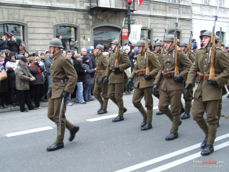 11 listopada 2007 , Obchody Święta Niepodległości na ul. Nowy Świat w Warszawie. Przemarsz grupy rekonstrukcyjnej piechoty polskiej z czasów Bitwy Warszawskiej 1920 r. Żołnierze uzbrojeni są w niemieckie karabiny Mauser (Gew 98), noszą polskie sukienne mundury polowe wzór 19 (kurtki zapinane na 5 guzików), ich głowy zabezpieczają polskie/ francuskie hełmy typu Adrian wz 15 (bez emblematów), ładownice typu niemieckiego.Skomentuj zdjęcie |