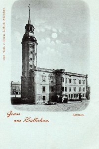 12 pobrań 1562 odsłony 6 średnia ocen Poprzednie i następne zdjęcia McAron Obiekty widoczne na zdjęciu Ratusz więcej zdjęć (66) Atrakcja turystyczna Zbudowano: XVI-XX w. Dawniej: Rathaus Zabytek: nr rej.: 64 z 15.10.1955 Ratusz w Sulechowie - pierwotna budowla została wybudowana w stylu gotyckim (zachowane piwnice). Zniszczona została przez pożary w 1577 i 1633 roku, odbudowana w XVII wieku w stylu barokowym. i przebudowana w II połowie XIX wieku. Zlikwidowano wtedy dwuspadowy dach i wybudowano w to miejsce trzecią kondygnację. Po II wojnie światowej, w latach 1966-1973 i 1989-1991 przeprowadzono wielkie prace remontowo-konserwacyjne wzmacniające konstrukcję budynku i wieży, na której wymieniono hełm. Zmieniono wówczas obramienie dachu zastępując neogotycki krenelaż pseudorenesansową attyką. pl. Ratuszowy więcej zdjęć (179) Dawniej: Markt, Rynek |