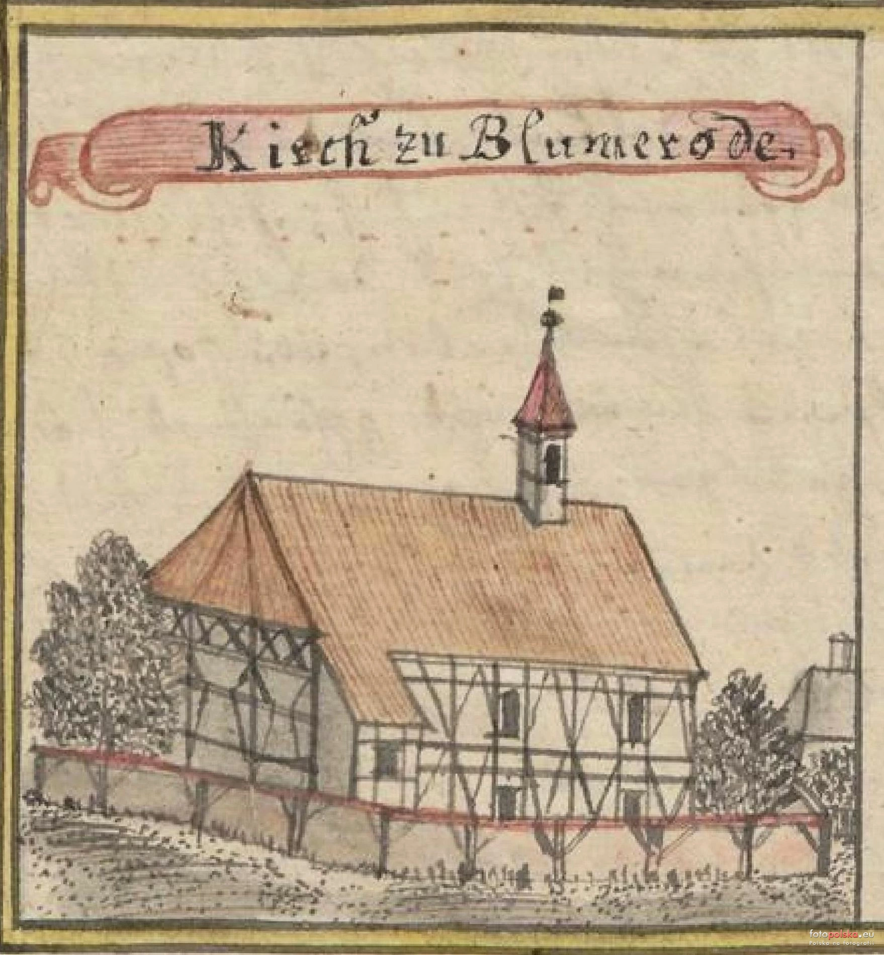 Lata 1740-1750 , Spalony w 1813 roku przez wojska francuskie i odbudowany w 1820 (prawdopodobnie w tym samym miejscu) kościół ewangelicki w Kwietnie (niem. Blumerode. Grafika Friedricha Bernharda Wernera z "Topographia Silesiae" z połowy XVIII wieku.Skomentuj zdjęcie |