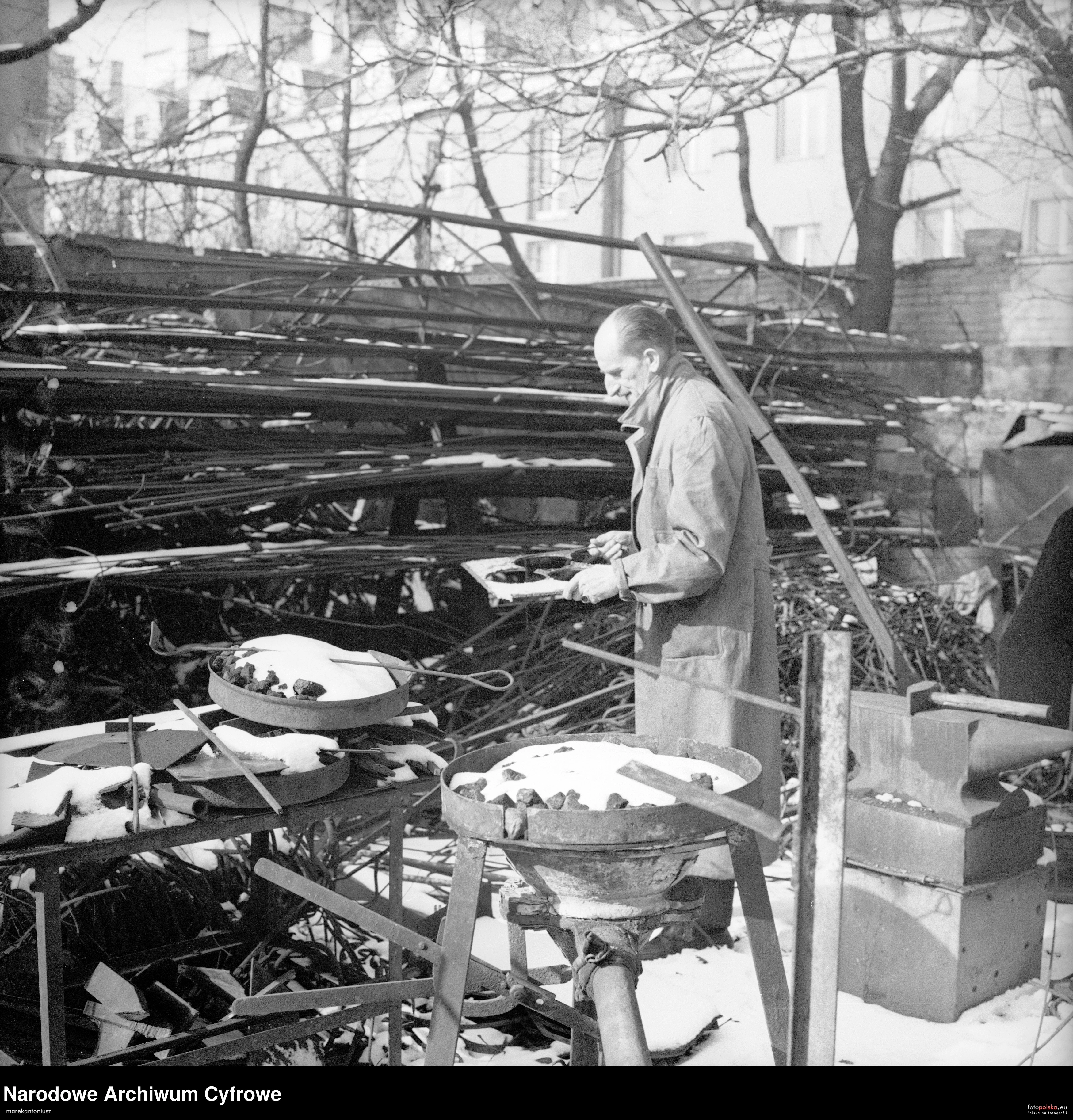 marzec 1968 , Wiktor Dmowski, właściciel zakładu kowalstwa artystycznego, podczas pracy na podwórku williSkomentuj zdjęcie |