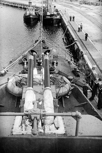 4 lipca 1947 , Okręt Wojenny ORP "Błyskawica" - stanowisko pojedyncze działa Mk XVI kal. 102 mm na pokładzie dziobowym.Skomentuj zdjęcie