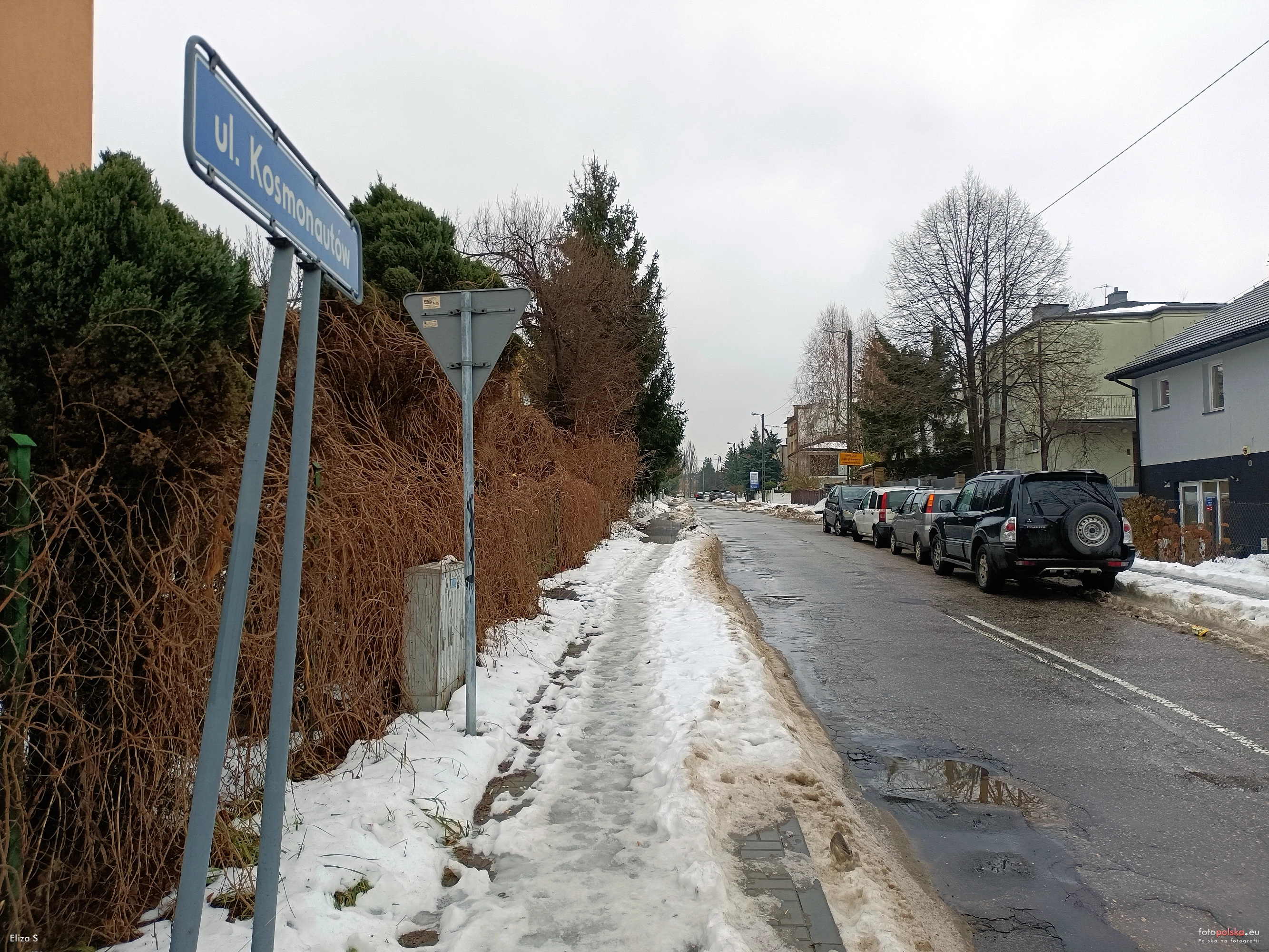 12 grudnia 2023 , Ulica Kosmonautów w kierunku ul. Sulisławickiej, widok na wysokości posesji Długa 94 (z lewej).Skomentuj zdjęcie |