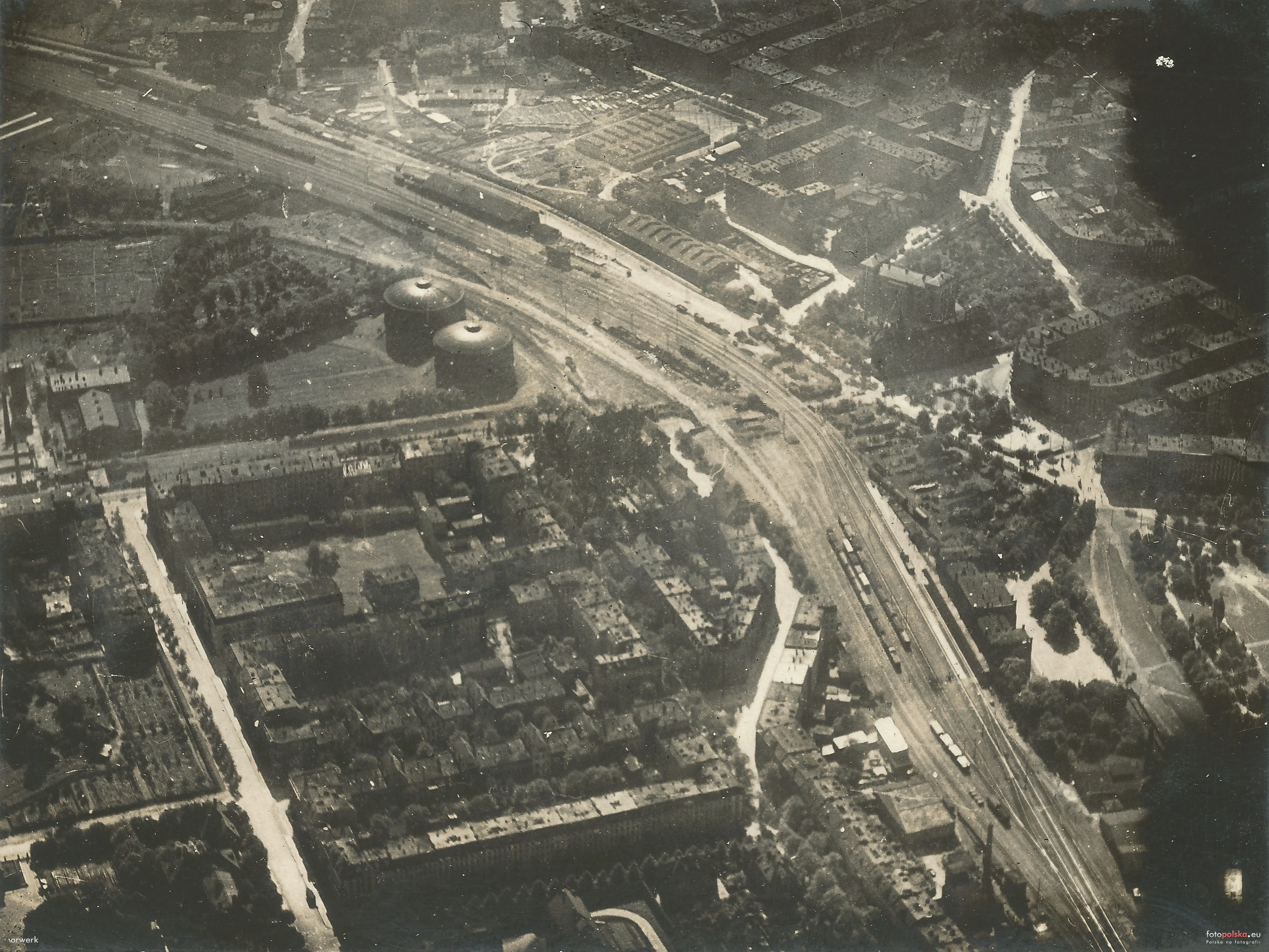 1916 , Kleczków oraz fragment Nadodrza z lotu ptaka w 1916 r., widok na wschód. Na dole zdjęcia zabudowa ul. Struga, ul. Zegadłowicza, ul. Kraszewskiego. Na górze okolice ul. Słowiańskiej a po prawej widać stację i dworzec Wrocław Nadodrze. Dobrze widać też charakterystyczne zbiorniki gazowni Ołbin -->Skomentuj zdjęcie