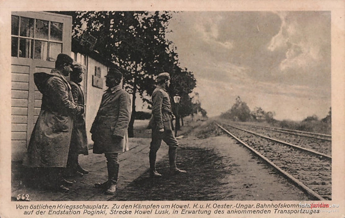 1917 , Austro-węgierska komenda kolejowa w oczekiwaniu na pociąg przy stacji końcowej Poginki na linii Łuck-Kowel.Skomentuj zdjęcie |
