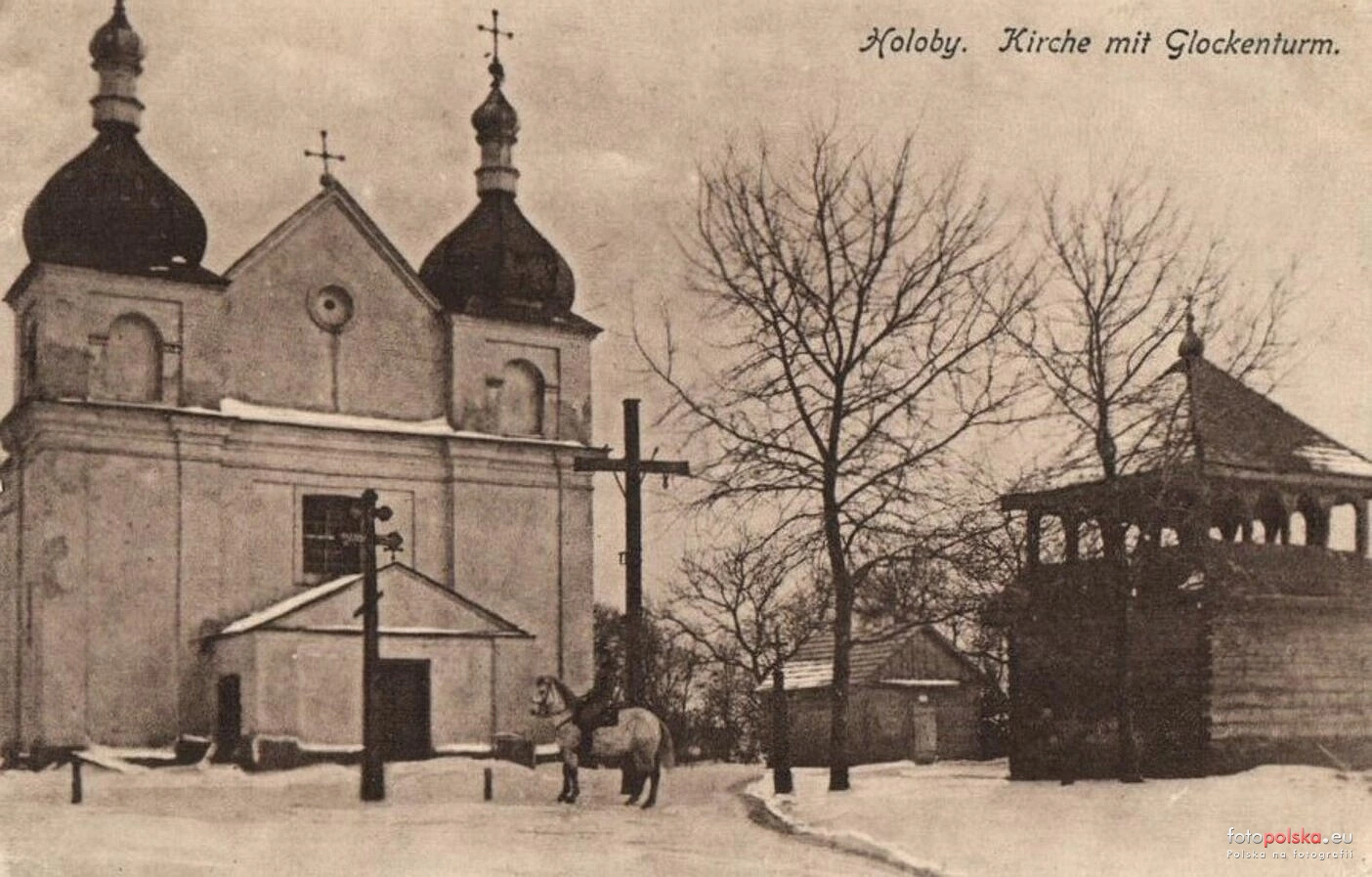 Lata 1915-1917 , Kościół katolicki (obecnie cerkiew) i dzwonnica w Hołobach.Skomentuj zdjęcie |