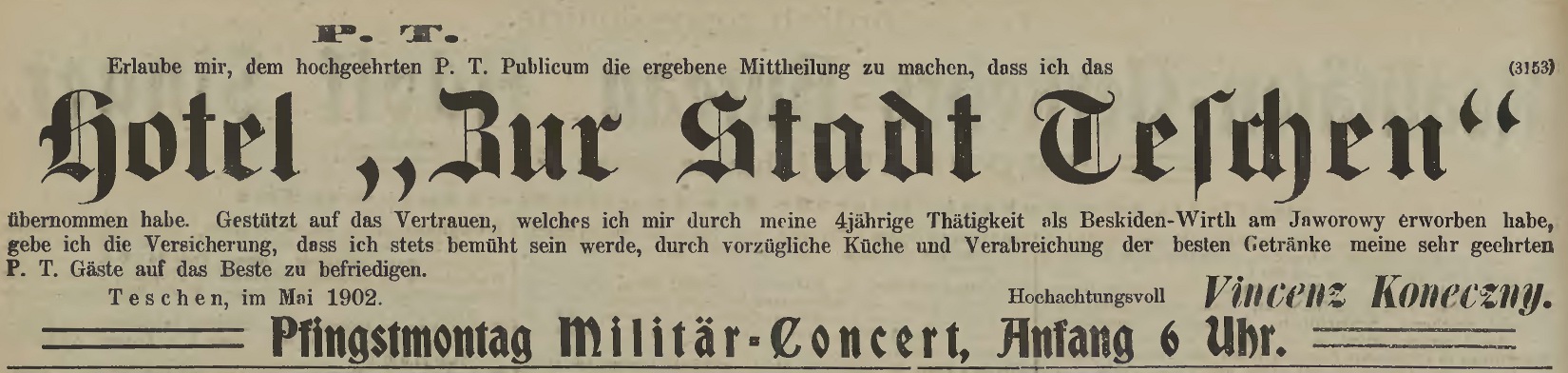 2 pobrania 169 odsłon 0 średnia ocen Poprzednie i następne zdjęcia DawnyCieszyn Obiekty widoczne na zdjęciu Frydecka 2 więcej zdjęć (23) Zbudowano: 1898 Dawniej: Hotel zur Stadt Teschen - Hotel pod miastem Cieszynem Narożna kamienica przypisana była do dzielnicy Saska Kępa z numerem konskrypcyjnym 2. Numery posesji były dwa. Dla ul. Ostrawskiej nr 1, natomiast dla ul. Frydeckiej nr 2. Obiekt powstał podług projektu Josefa Motiky w 1898 r. w miejscu spalonej w 1894 r. dawnej kuźni . Jego właściciel - Johann Bobek - urządził tu kolejny, piąty już w Cieszynie duży hotel, który nazwał Hotel zur Stadt Teschen - Pod miastem Cieszynem. Także tu, obok sal restauracyjnych pomyślano o rozrywce dla gości, urządzono m. in. salę bilardową. W 1903 r. dobudowano stajnię. Kamienica posiadała zegar umieszczony w rogowej wieżyczce. W 1906 r. doszło do tragicznego wypadku - o godzinie 6 rano zastrzelił się w restauracji kapral 100. pułku piechoty. Samobójca strzelił najpierw 2 razy do swojej kochanki kelnerki po czym broń skierował przeciwko siebie. Hotel prowadzony był przez Johanna i Antonię Bobków do 1909 r. Po tym okresie nowym hotelarzem stał się Josef Zipser. W 1916 r. wybuchł pożar na strychu, który zniszczył cały dach i wszystkie przedmioty znajdujące się na strychu. Pożar gasiły straże pożarne z fabryki Kohna, cieszyńska oraz oddział wojska. Możliwe, iż wskutek pożaru zniknął również zegar w wieży narożnej. Przed podziałem miasta w 1920 r. ulokowano tu Miejski Urząd Podatkowy. Po podziale miasta w 1920 r. część pomieszczeń wynajmował Urząd Miejski Czeskiego Cieszyna, zanim ten przeprowadził adaptację starej kamienicy Altmannów , do której się później przeprowadził. W tym czasie sala bilardowa służyła za salę do obrad. A tak relacjonuje Gwiazdka Cieszyńska skutki podziału miasta i zarazem narodziny Czeskiego Cieszyna: na jednym wozie przewieziono przez most na Olzie akta i umeblowanie czeskiej prefektury. Taki początek miał miasto Czeski Cieszyn. W pierwszych dniach widok był dość okropny po mieście jeździły wozy z ludzkim dobytkiem raz do tego miasta potem do tamtego. Ludzie się przeprowadzali z państwa do państwa. Właścicielem restauracji był od 1 lipca 1927 r. Józef Czakan z Kocobędza (o koncesję ubiegał się już w 1920 r.). W 1924 r. działa tu warsztat zegarmistrza Ernesta Lukasa, który później prowadził Józef Pollak (również po II wś.). Od 1925 r. (rok założenia w Cz. Cieszynie, patrz również Bank Ewangelicki w Cieszynie) znajdował się na pierwszym piętrze Bank Ewangelicki (w grudniu 1930 r. otworzył swoją filię w Trzyńcu). W 1930 r. na walnym zebraniu ogłoszono, że bank posiada przeszło pół miliona koron wkładek, około 100.000 Kcz własnego kapitału, w tym przeszło 30.000 Kcz funduszu rezerwowego. W ciągu 3 lat mogła zatem spółka dzięki oglądnej i ostrożnej pracy zapłacić nie tylko kompletne urządzenie kancelaryjne i kasowe, ale nadto ugospodarzyć jeszcze przeszło 30.000 koron. Dyrektorem był Józef Kożdoń, zaś dyrektorem rewizyjnym Hoffmann. Kredo banku brzmiało: Jest obowiązkiem każdego uświadomionego Ślązaka, by grosz swój, względnie część majątku swego oddał pod zarząd swoich krajan, swoich, a nie obcych ludzi lub inny kredo: Majątek naszego ludu należy pod zarząd naszych ludzi! Czemuż groszem twoim zawiadować mieliby obcy? Bank miał za zadanie uniezależniać krajan od obcych kapitałów, czyli odnosił się do innego kredo: "Swój do swego". Bank Ewangelicki zrzeszał ludność o orientacji Ślązakowskiej. Początkiem kwietnia 1929 r. bank przeniósł swą siedzibę do ratusza. Bank płacił czynsz 1200 a w ostatnim roku 1500 kcz. W budynku miało swoją siedzibę Kobiece Stowarzyszenie Ewangelickie (Evangelische Frauenverein), które w grudniu 1929 r. zorganizowało wystawę rękodzieł na pierwszym piętrze. Dochód z wystawy i sprzedaży był przeznaczony na zaszczytne cele.Od 1926 r. miał tu swój zakład krawiecki na drugim piętrze Józef Sikora. W tym samym roku następcy prawni Bobek żądali odszkodowanie za zajęcie - konfiskatę pokoi dla urzędu mieszkaniowego 99 tys. koron. Ostatecznie podjęto decyzję o wypłacie wysokości 20 tys. oraz umorzenia wszystkich podatków dotyczące realności do 1926 r. W 1930 r. odbywały się na pierwszym piętrze próby męskiego chóru Frohsinn. Po II wś. jedno z pomieszczeń wykorzystywano za warsztat naprawy obuwia. Obecnie na parterze mieści się gospoda Slavoj, natomiast na pozostałych piętrach znajdują się mieszkania czynszowe. W narożnej wieży, gdzie wcześniej znajdował się zegar umieszczono okrągłą tarczę, na której widnieje czerwona żaba na białym tle. Jest to symbol polskiego stowarzyszenia: Beerclub, Brać Kuflowa na Zaolziu.Wspomnienie o Janie Bobku: W minioną sobotę zmarł po krótkiej chorobie w 72 roku życia tutejszy obywatel Jan Bobek. Zmarły był w Cieszynie z dawniejszych lat znaną postacią; pochodząc ze stanu robotniczego dorobił się wielką ruchliwością i oględnością znacznego majątku. On zbudował przed 30 laty naprzeciwko „Demellochu", tam, gdzie się stykają ulice Jabłonkowska, Frydecka i Ostrawska piękny naówczas dwupiętrowy budynek, który następnie nazwał „hotelem miasta Cieszyna". Obok tego hotelu postawił jeszcze dwa dalsze budynki mieszkalne. Po wojnie, kiedy władze nie udzieliły już więcej koncesji na prowadzenie hotelu, kiedy władze zajęły przymusowo znaczną część ubikacyj i zawiadowanie tymto majątkiem stało się coraz trudniejszym, odsprzedał dwa domy krajowi, który tam umieścił zimową szkołę rolniczą, zaś dawniejszy hotel oddał w zawiadowanie ks. Zahradnikowi, Kożdoniowi i Ostrużce z tym zobowiązaniem, że ci czysty dochód z tego budynku obrócą na cele dobroczynne. Jak długo testator żył, nie można było myśleć o jakimś czystym zysku, gdyż p. Bobek zast