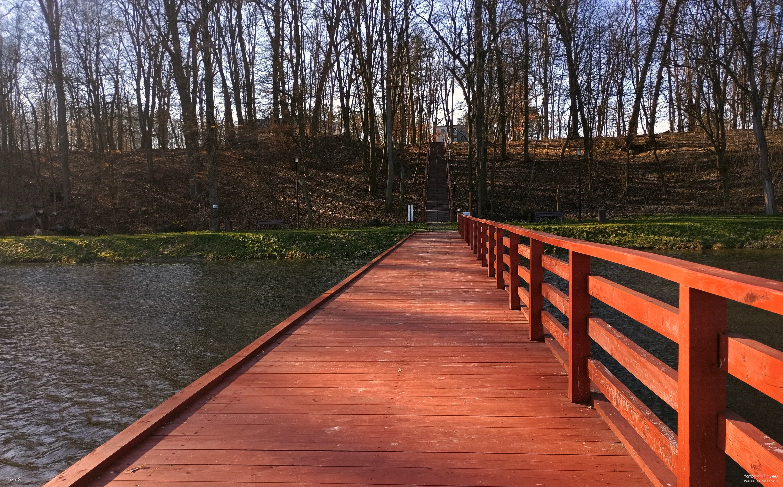 16 lutego 2024 , Drewniane molo na zbiorniku małej retencji, widok w kierunku schodów terenowych na zboczu dawnego parku dworskiego.Skomentuj zdjęcie |