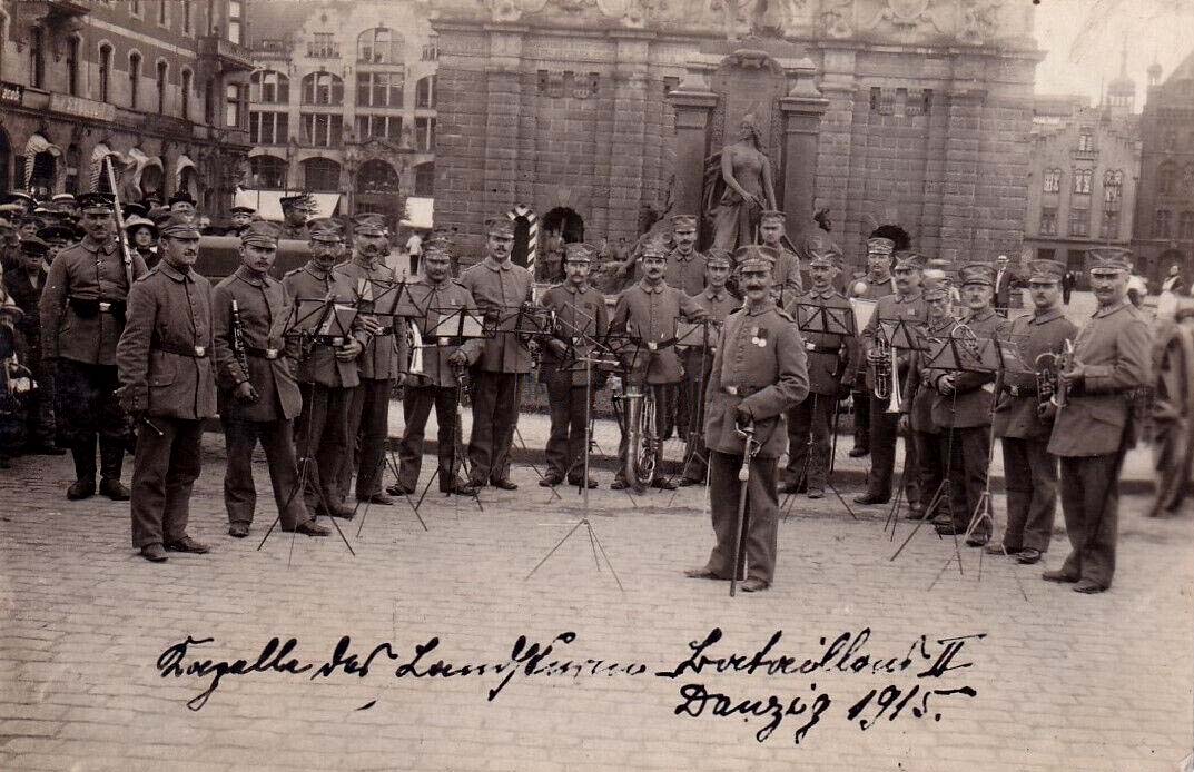 1915 , Wojskowa orkiestra przed pomnikiem cesarza Wilhelma I, przy Bramie Wyżynnej.Skomentuj zdjęcie
