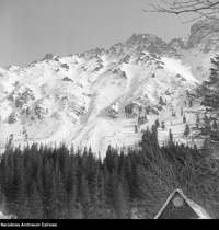 marzec 1975 , Widok z Morskiego Oka na Żabie Szczyty - od prawej Żabi Szczyt Niżni, Żabie Kopki, Żabia Czuba, z lewej Siedem Granatów