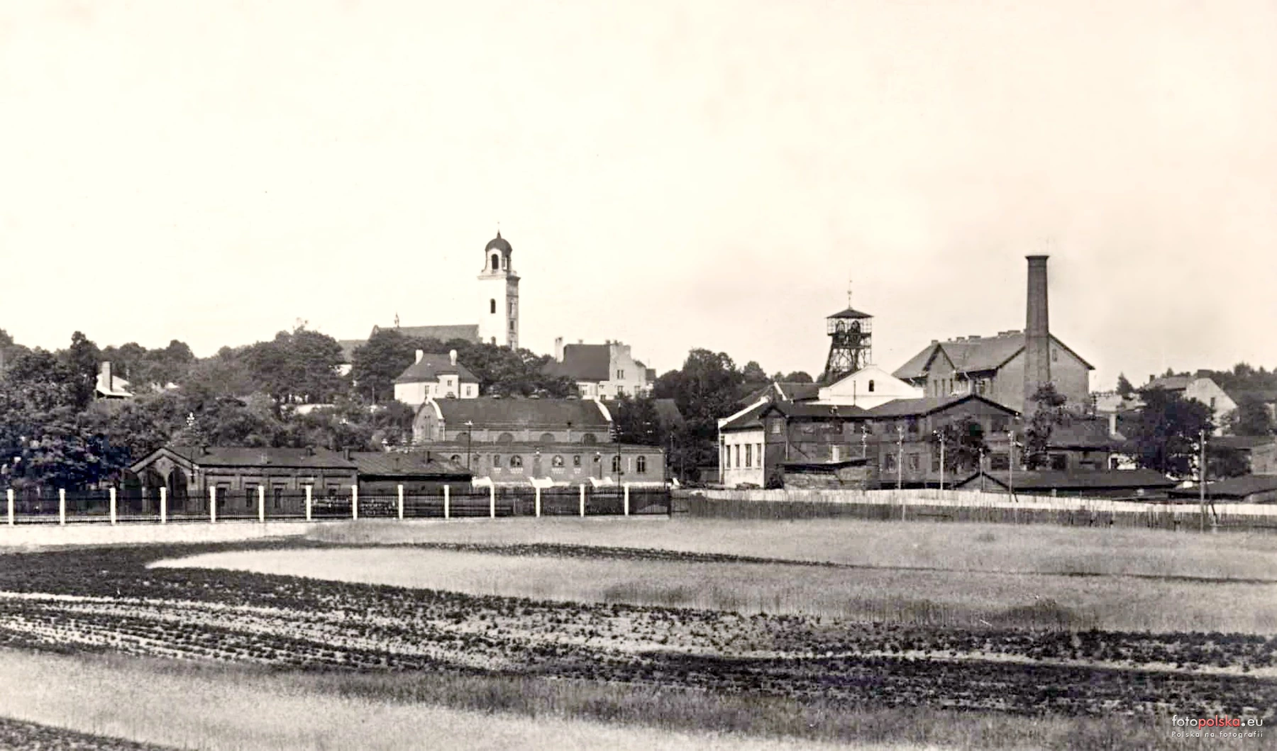 Lata 1913-1918 , Fragment zabudowy w pobliżu ulicy Grunwaldzkiej (w miejscu obecnej Galerii Galena), widoczny kościół, budynek plebanii i kopalnia. |