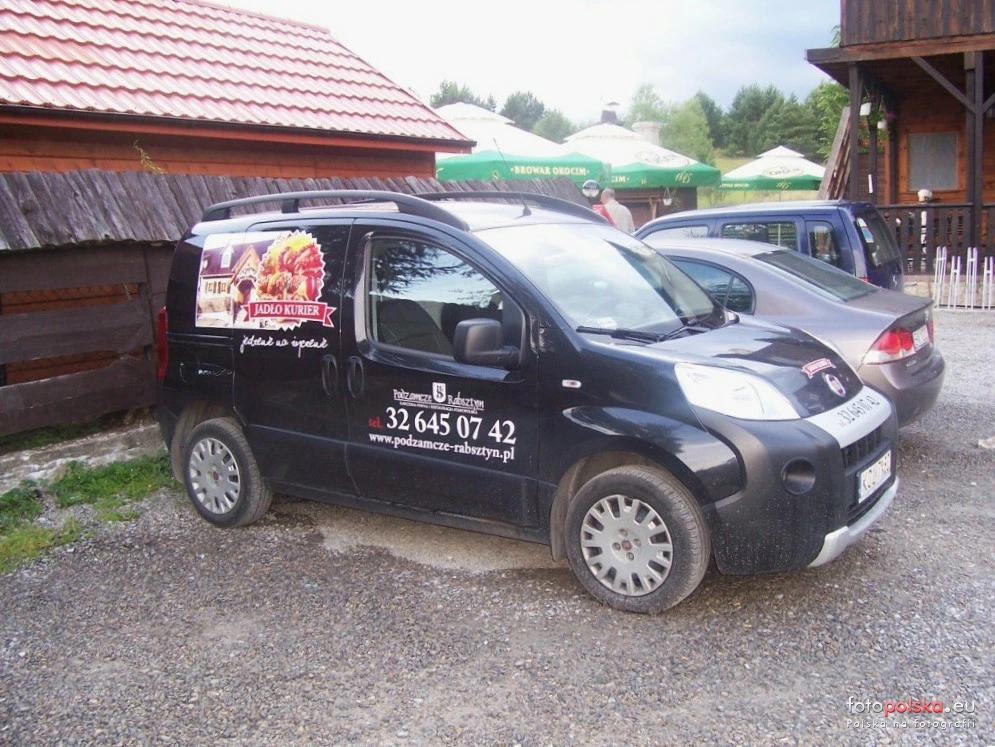 19 czerwca 2011 , Podzamcze Rabsztyn, samochód dostawczy ,,Jadło kurier'' na tle zabudowań karczmy.Skomentuj zdjęcie
